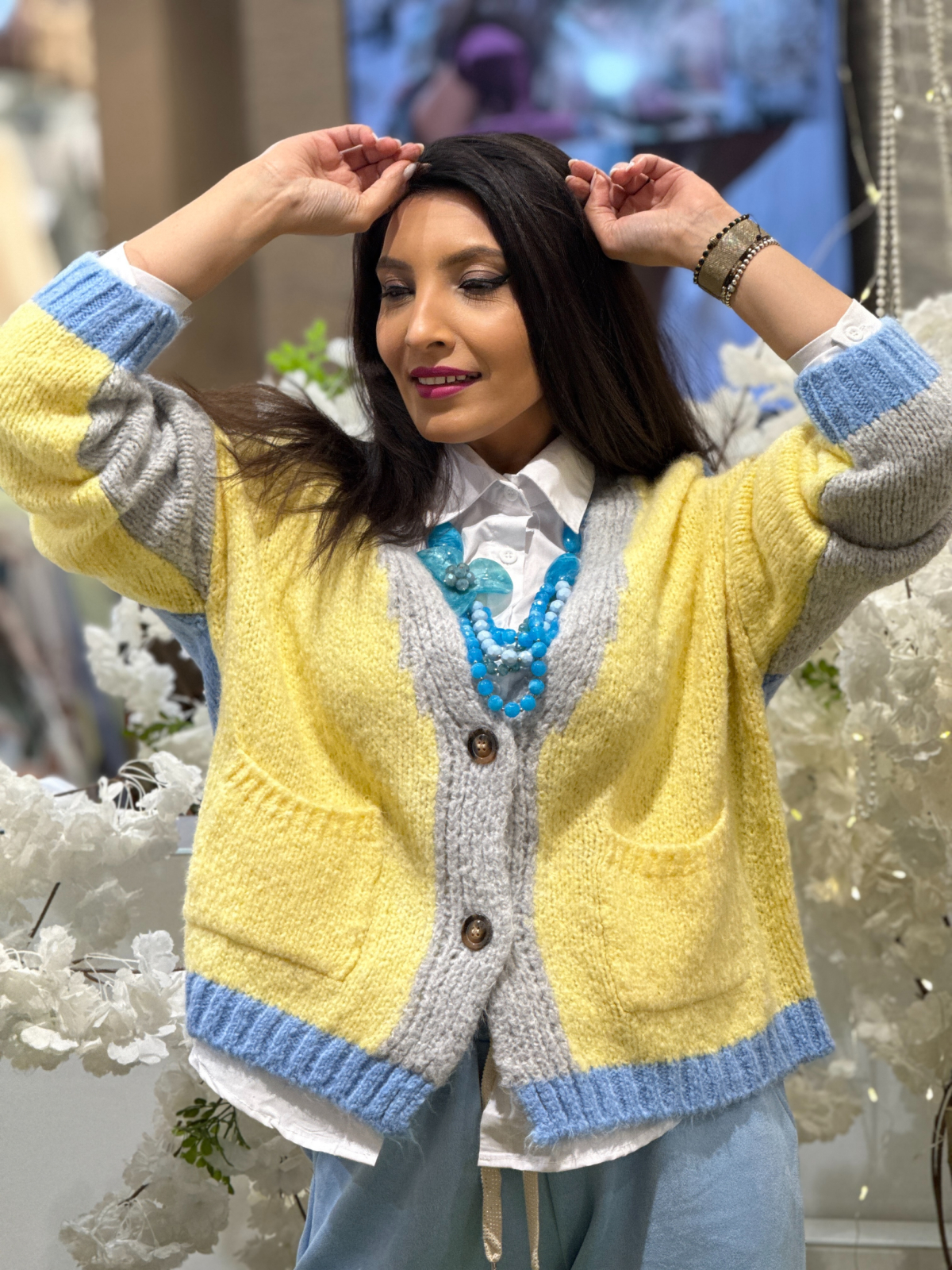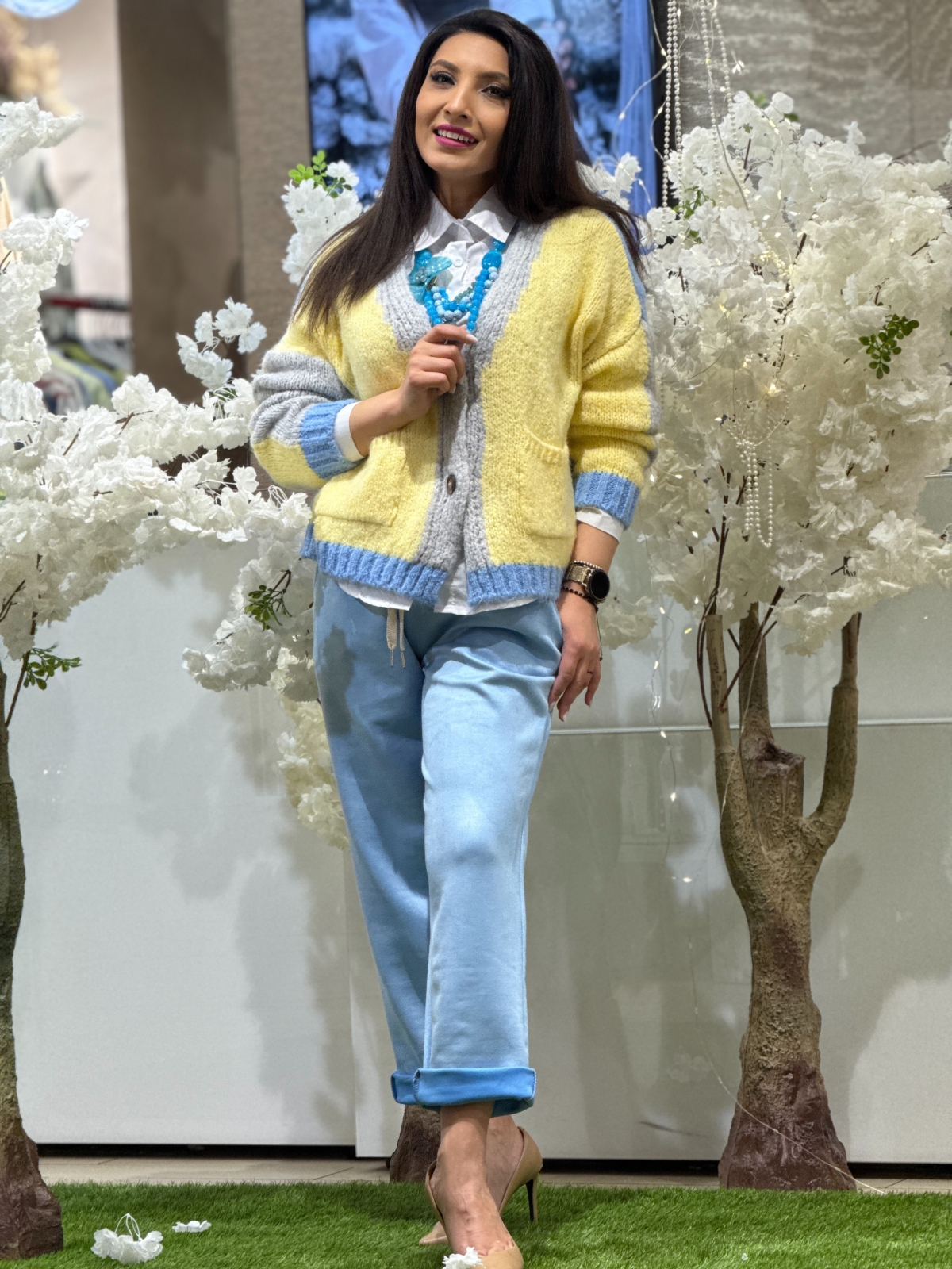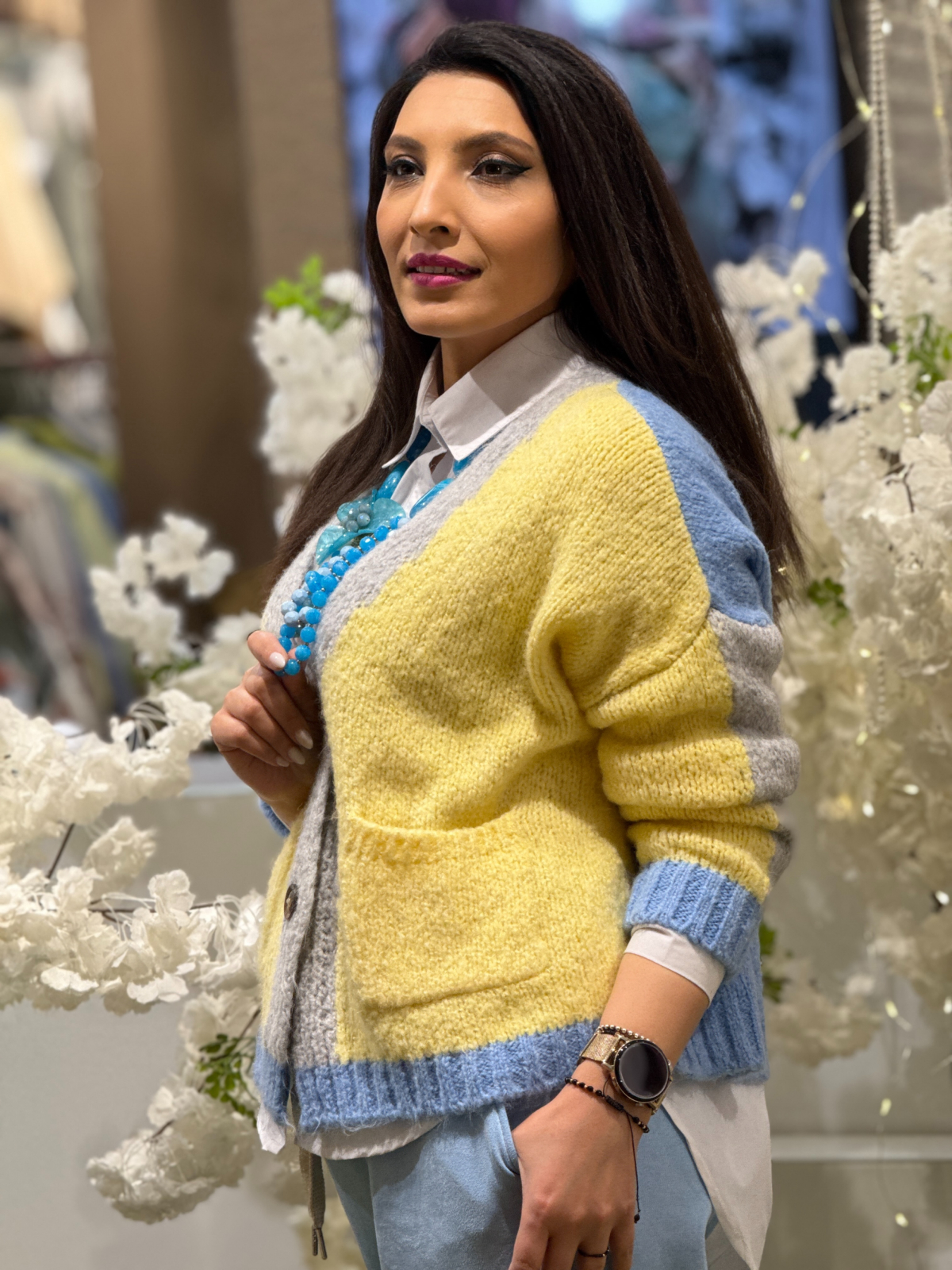 Anchiorul în V pune în valoare zona gâtului și adaugă o notă feminină, iar nasturii decorativi completează designul cu un detaliu subtil, dar de efect.