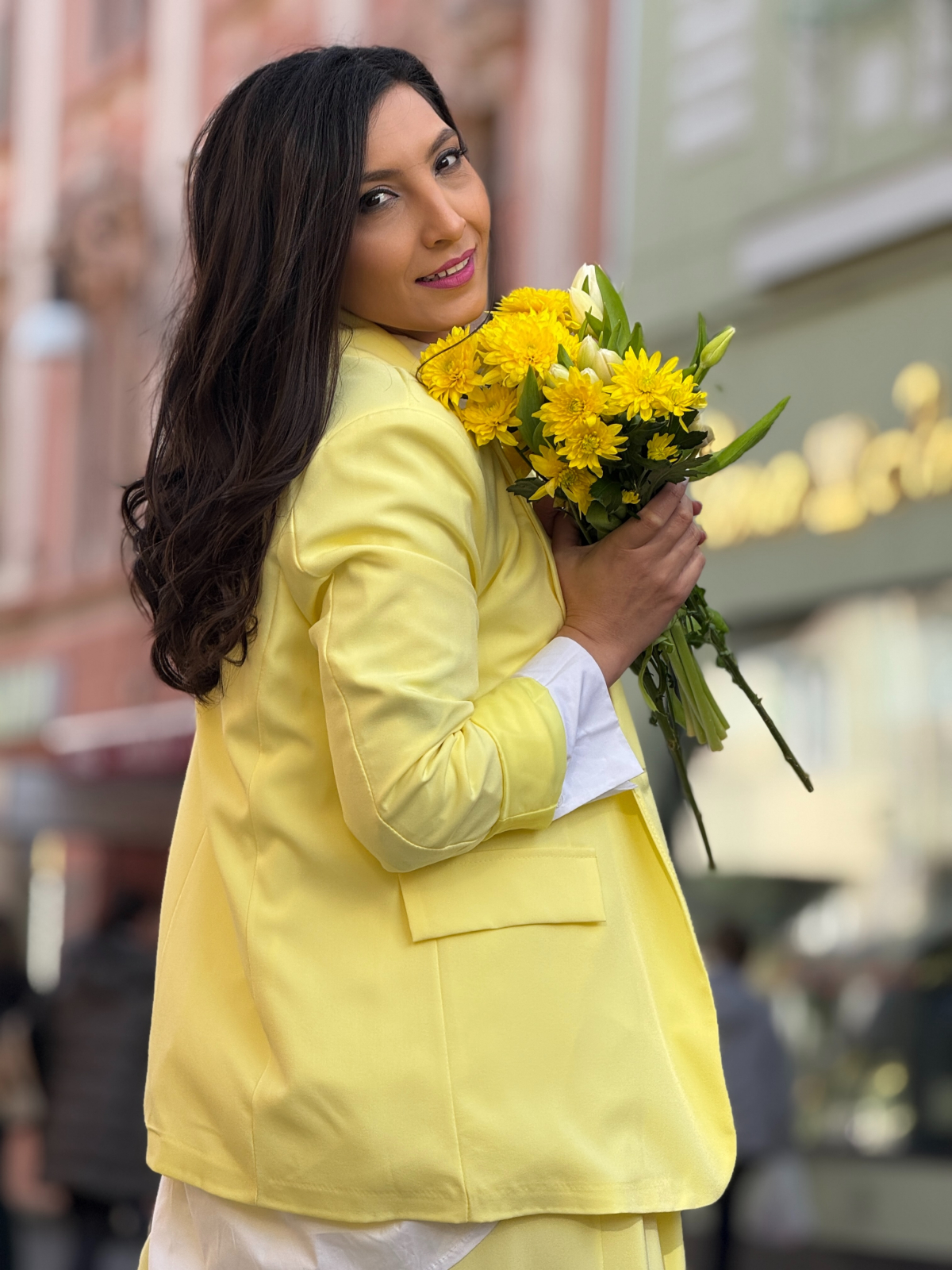 Poți purta acest sacou la birou sau în oraș, cu o pereche de pantaloni eleganți sau o fustă feminină. Este versatil și se adaptează stilului tău personal.