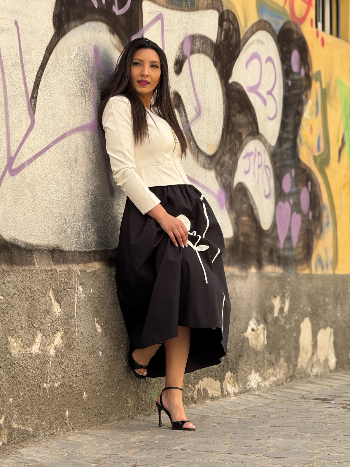 În această fustă cu floare albă aplicată, te vei simți întotdeauna încrezătoare și liberă. Croiala sa modernă și materialele de calitate asigură confortul pe tot parcursul zilei.