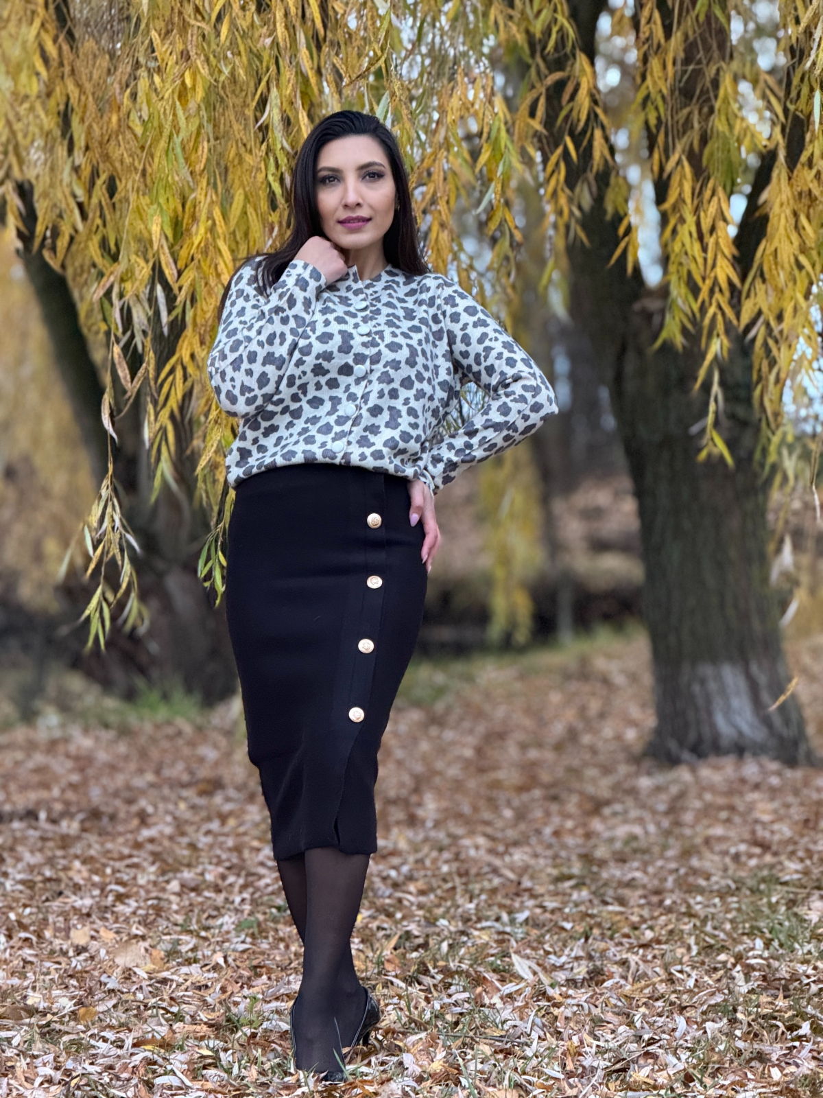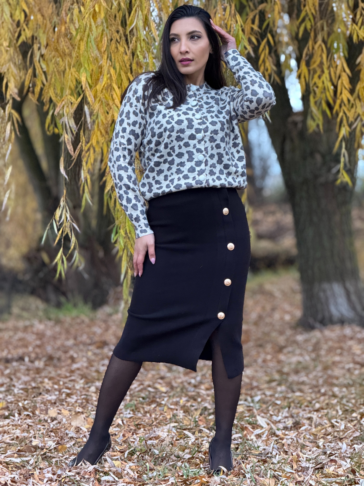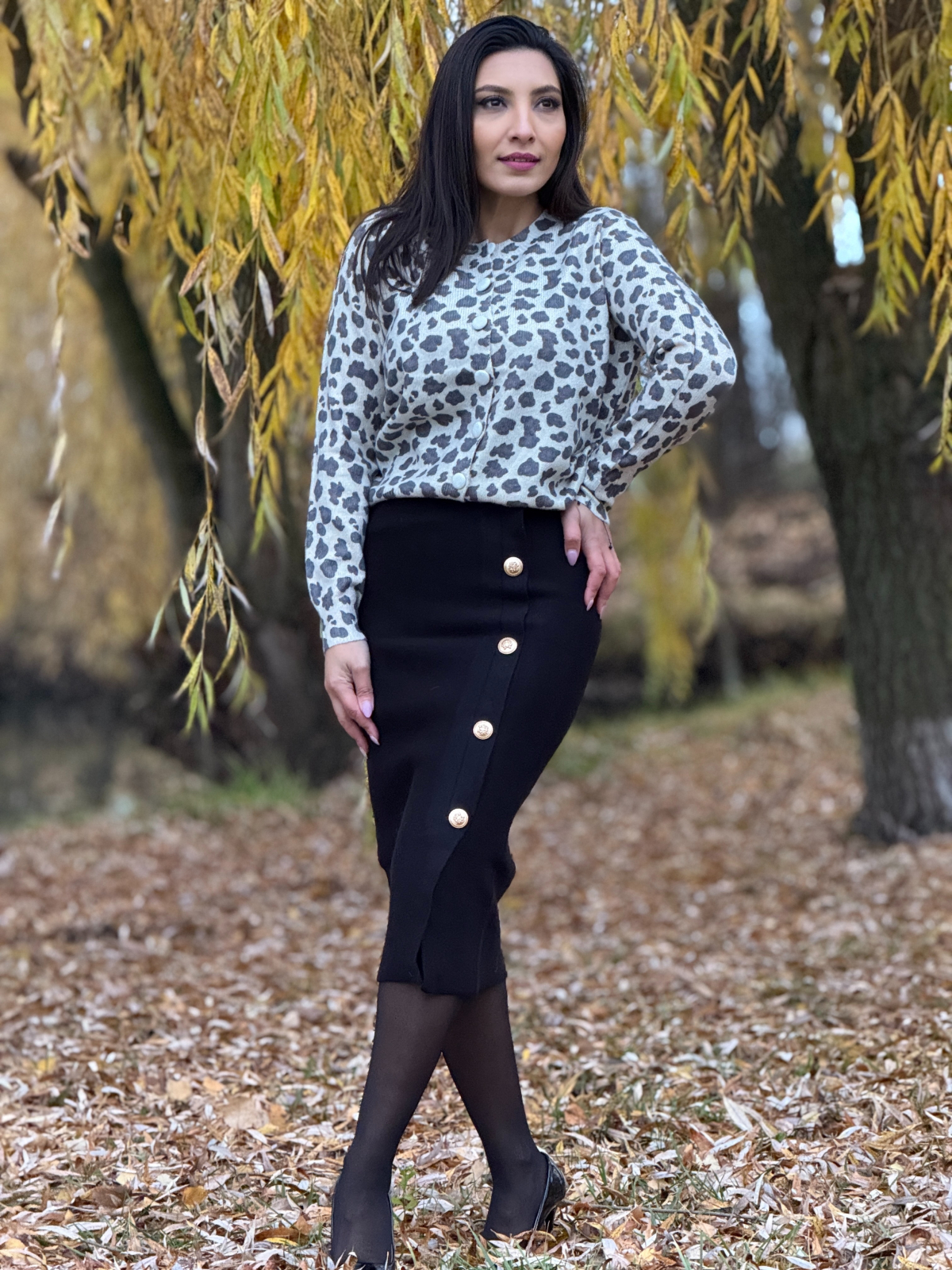 Fusta lungă tricotată cu nasturi decorativi este o piesă versatilă și feminină, ideală pentru a adăuga eleganță și confort ținutelor tale de zi cu zi.