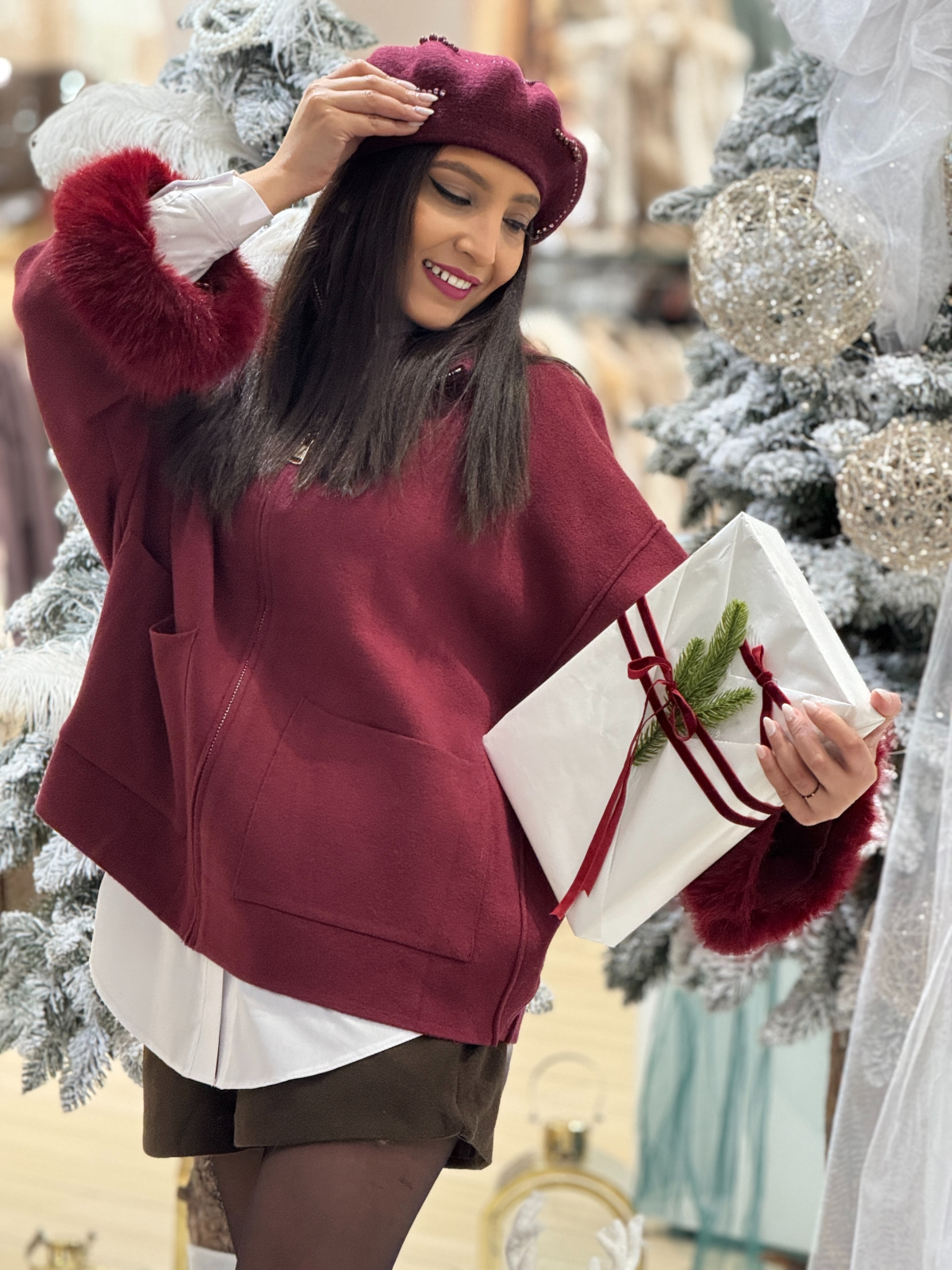 • Jacheta cu fermoar și blăniță la mânecă este o alegere inspirată pentru sezonul rece, combinând confortul cu accente elegante.
