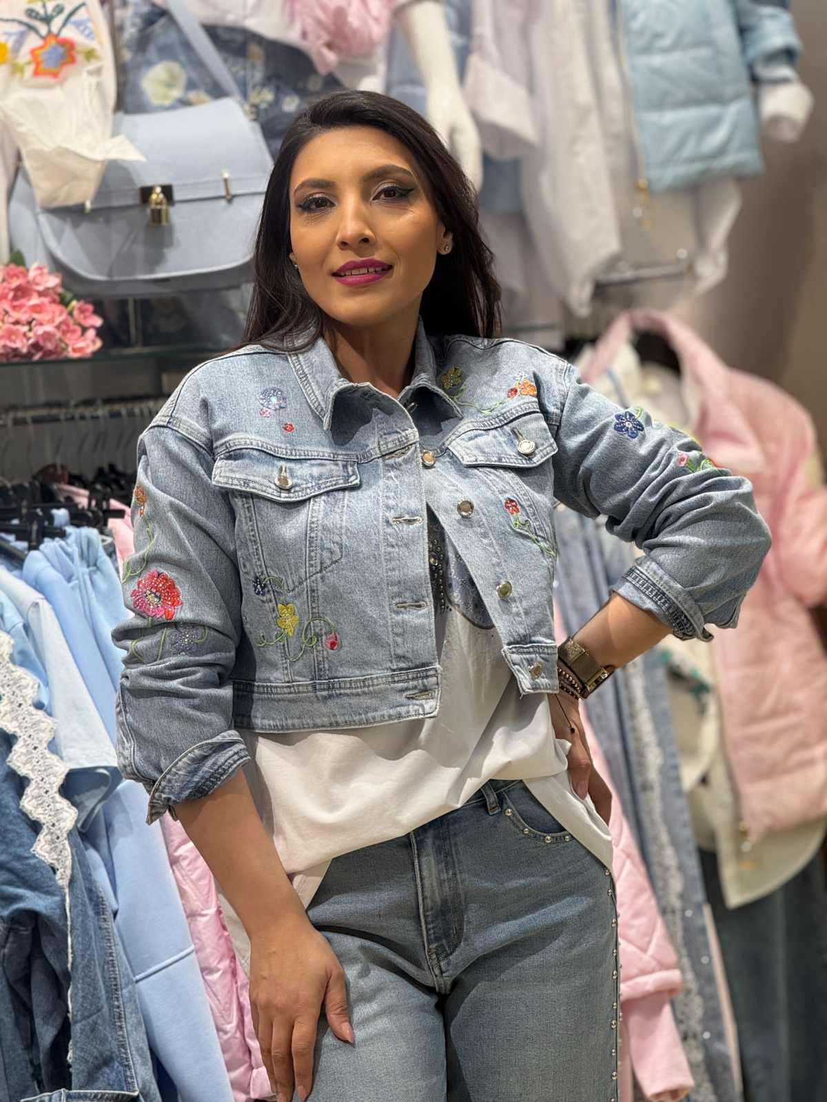 Aceasta geacă din blugi cu floricele brodate îți oferă o stare de bine și un confort desăvârșit. Vei simți încrederea în fiecare pas.