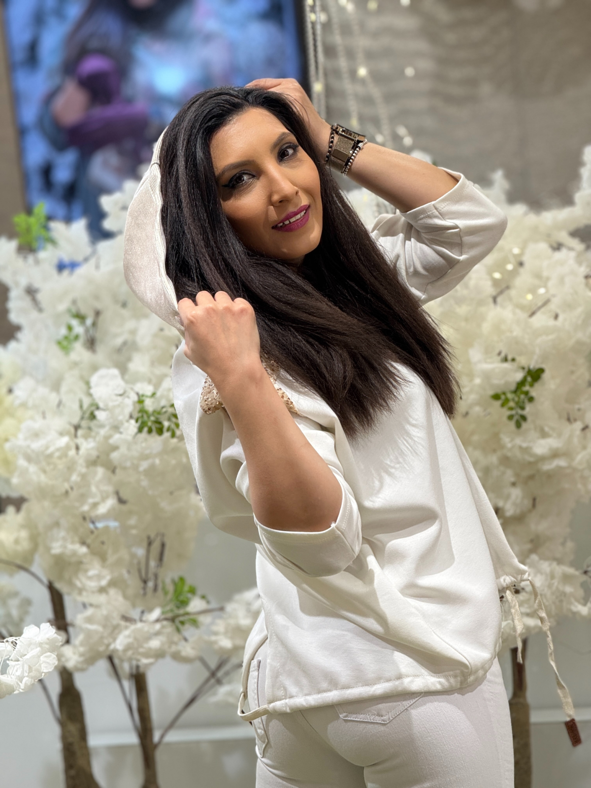Jacheta cu glugă și imprimeu cu steluțe este o piesă casual, perfectă pentru a adăuga un aer relaxat și jucăuș ținutelor de zi. Imprimeul discret cu steluțe aduce un plus de personalitate fără a încărca vizual look-ul.