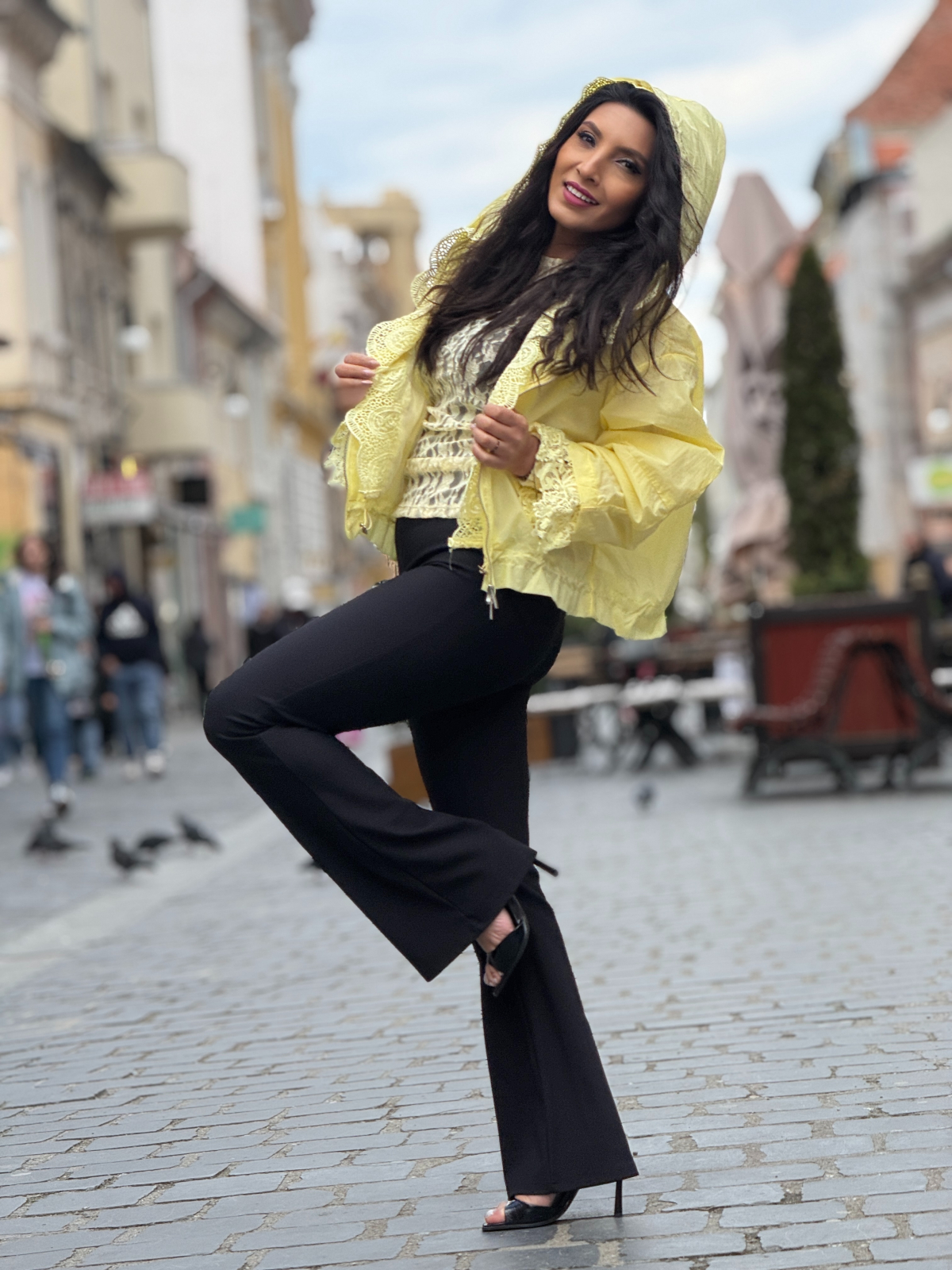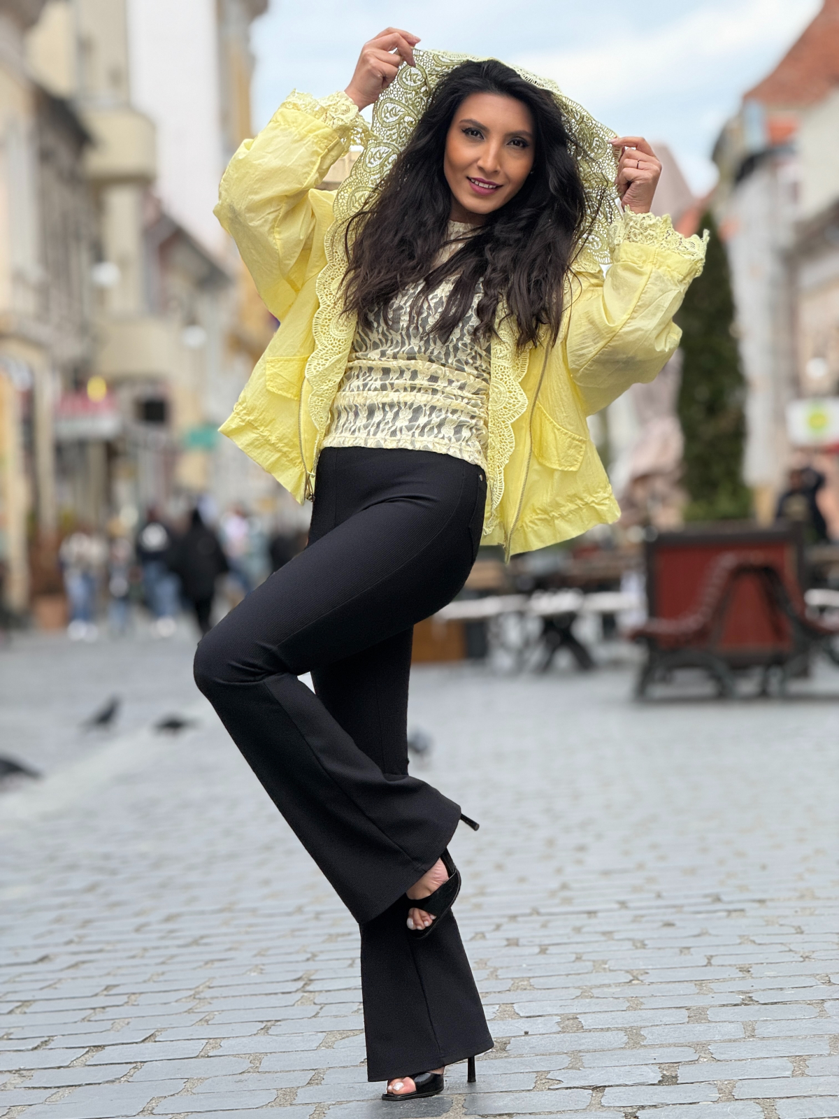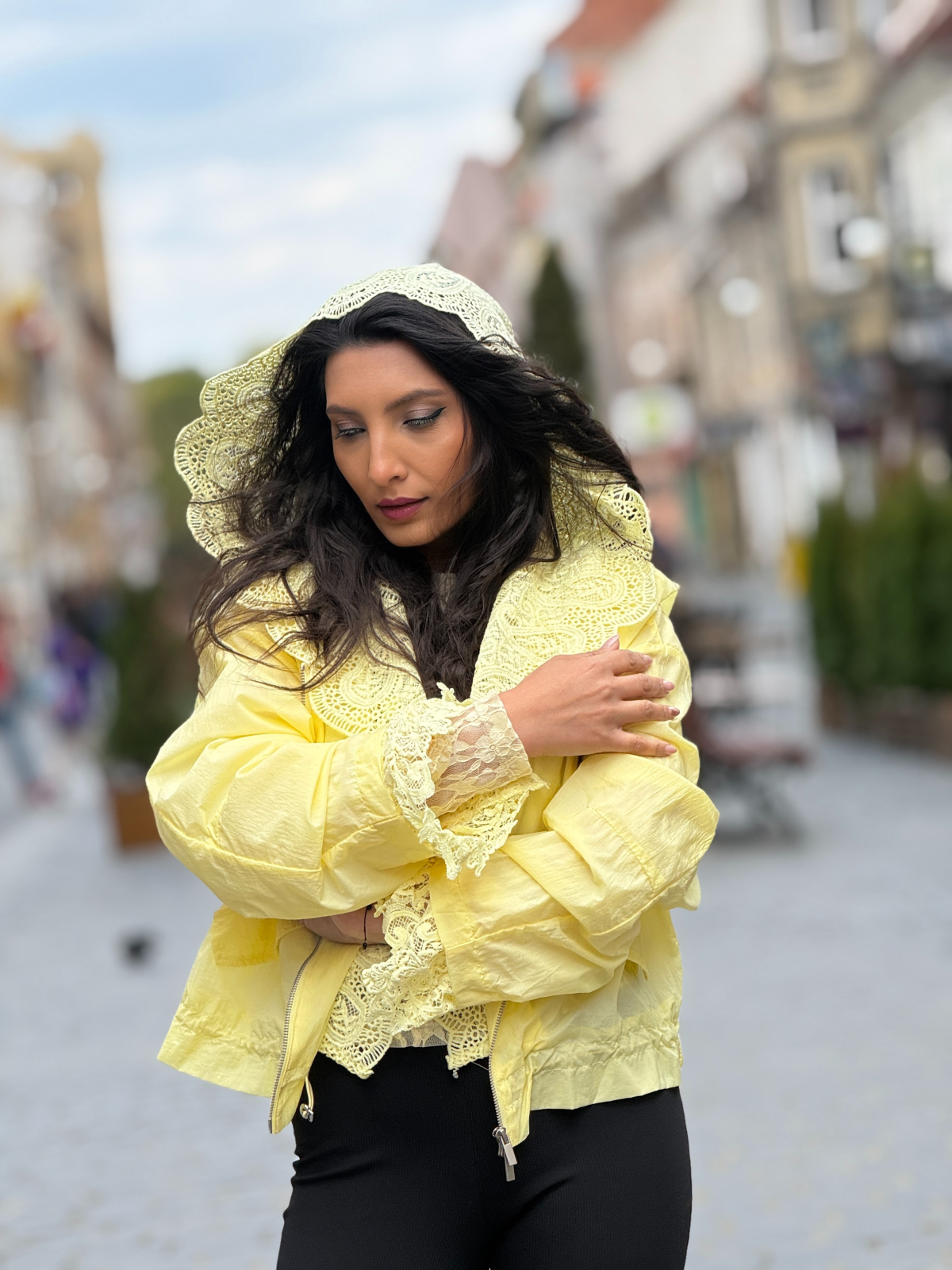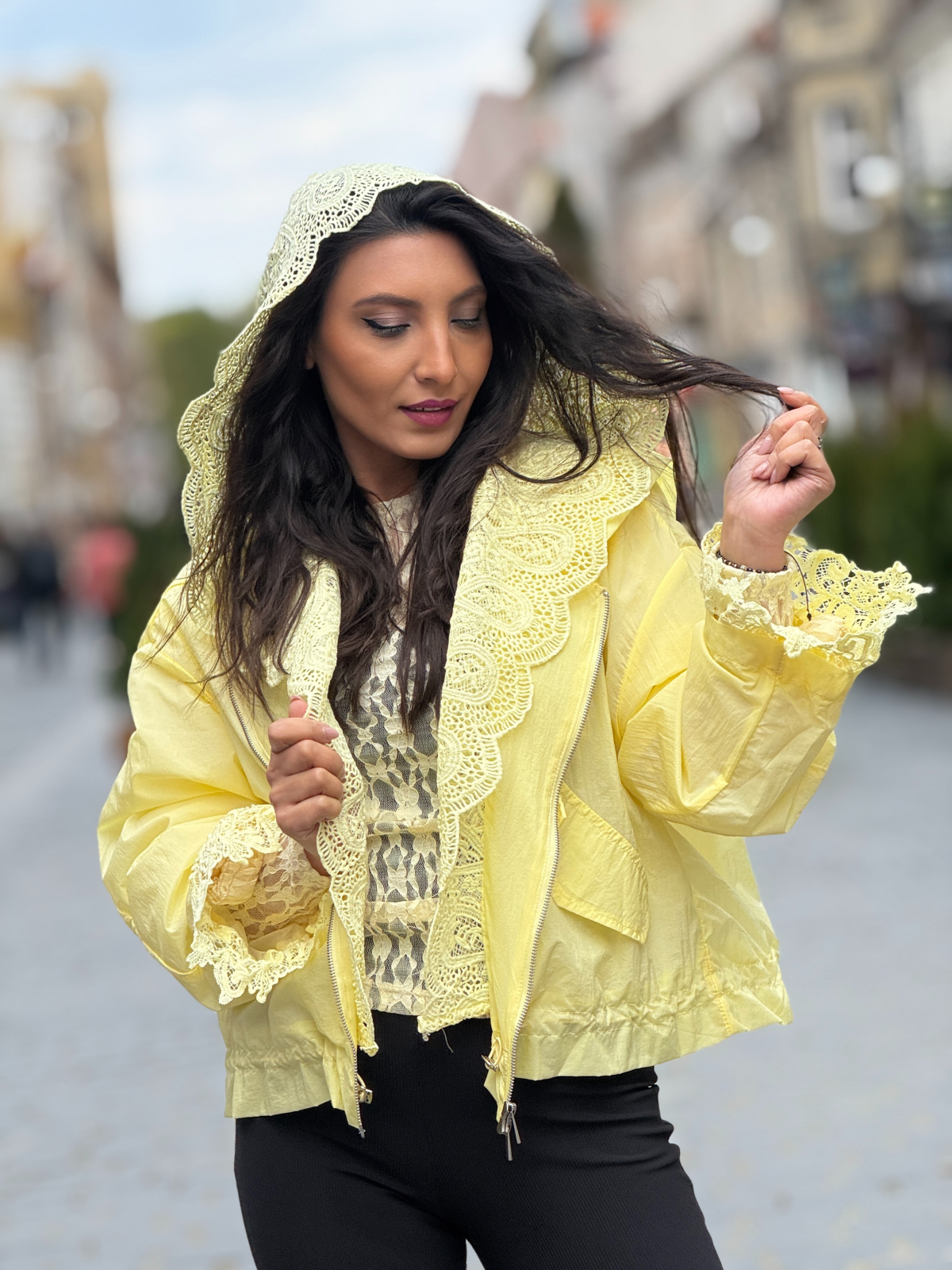 Cu o croială lejeră și detalii fine de dantelă, această jachetă îți oferă un confort de neegalat.