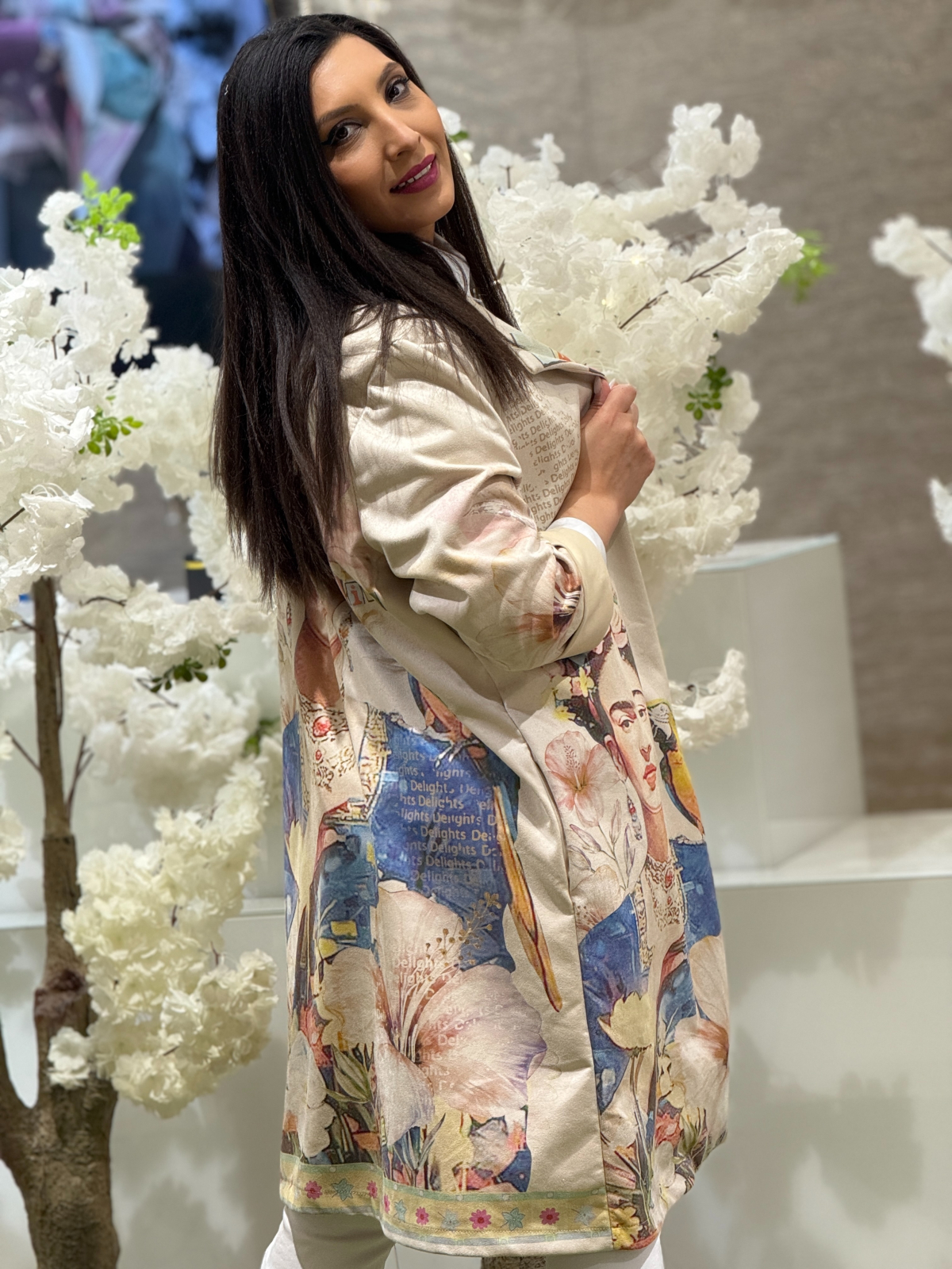 • Cu o croială cambrată care evidențiază linia taliei, acest sacou iese în evidență prin imprimeul său expresiv și modern, inspirat din arta contemporană.