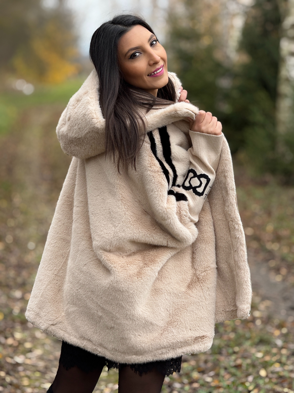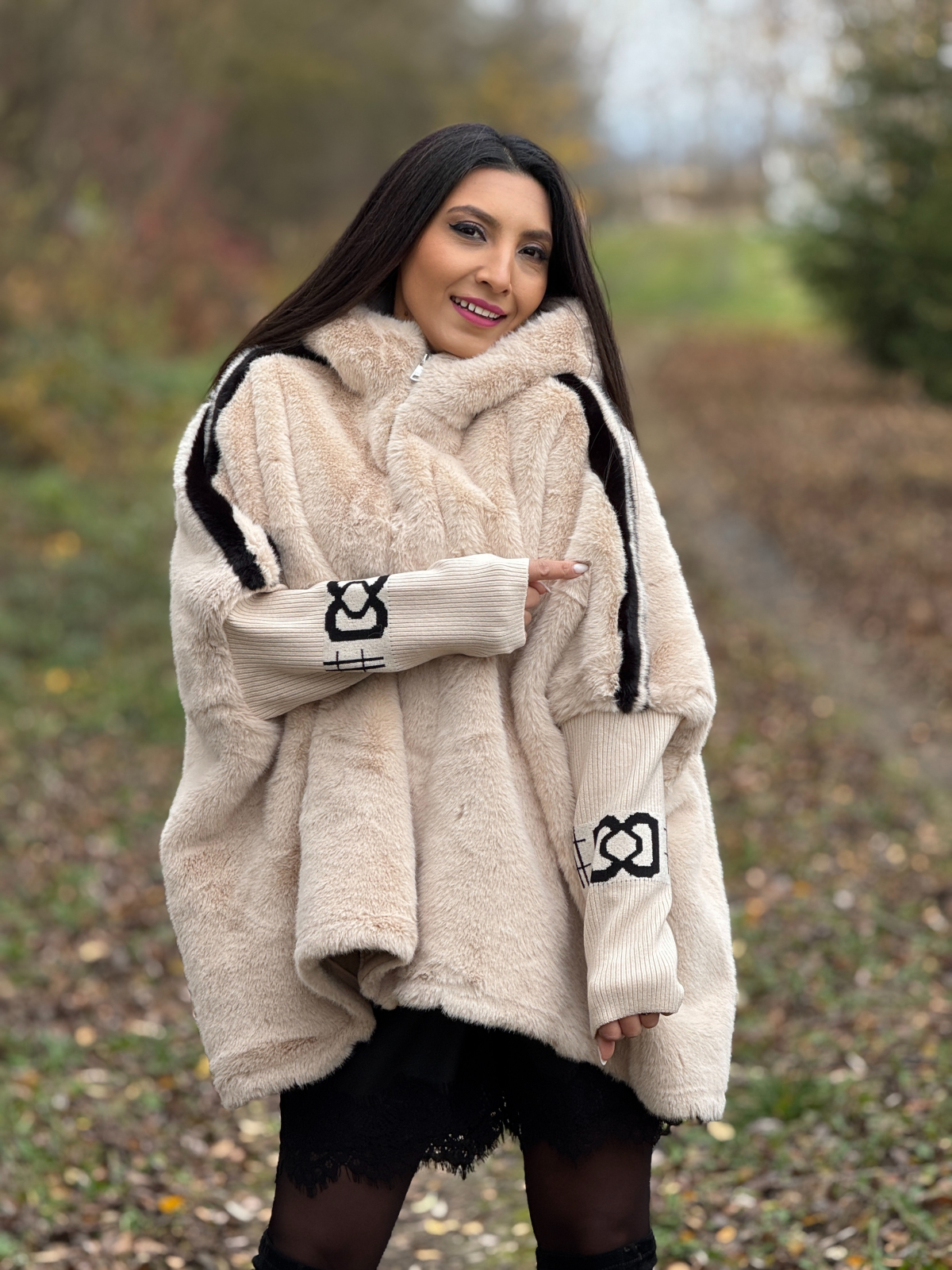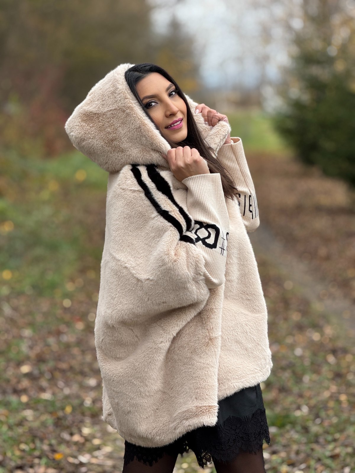 Haina din blană ecologică cu dungă pe mânecă este o piesă statement, care adaugă stil și căldură ținutelor de iarnă, fără a compromite confortul.