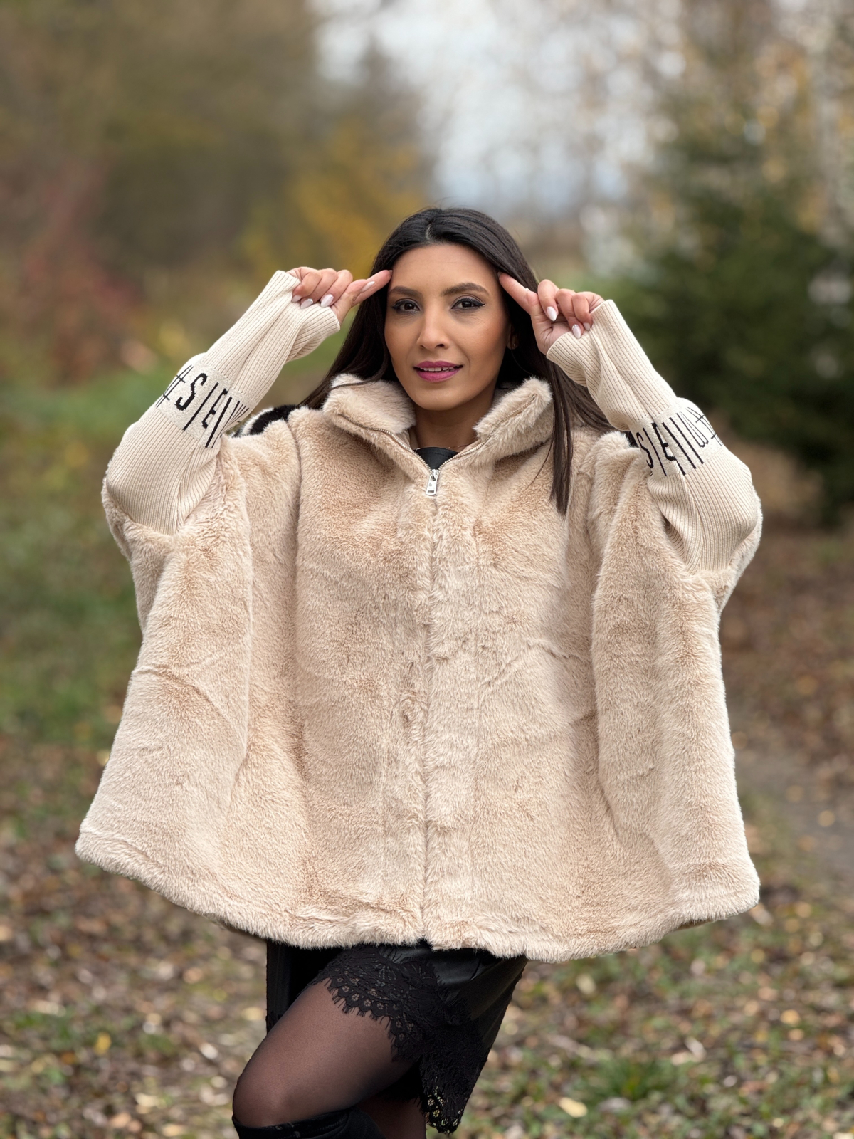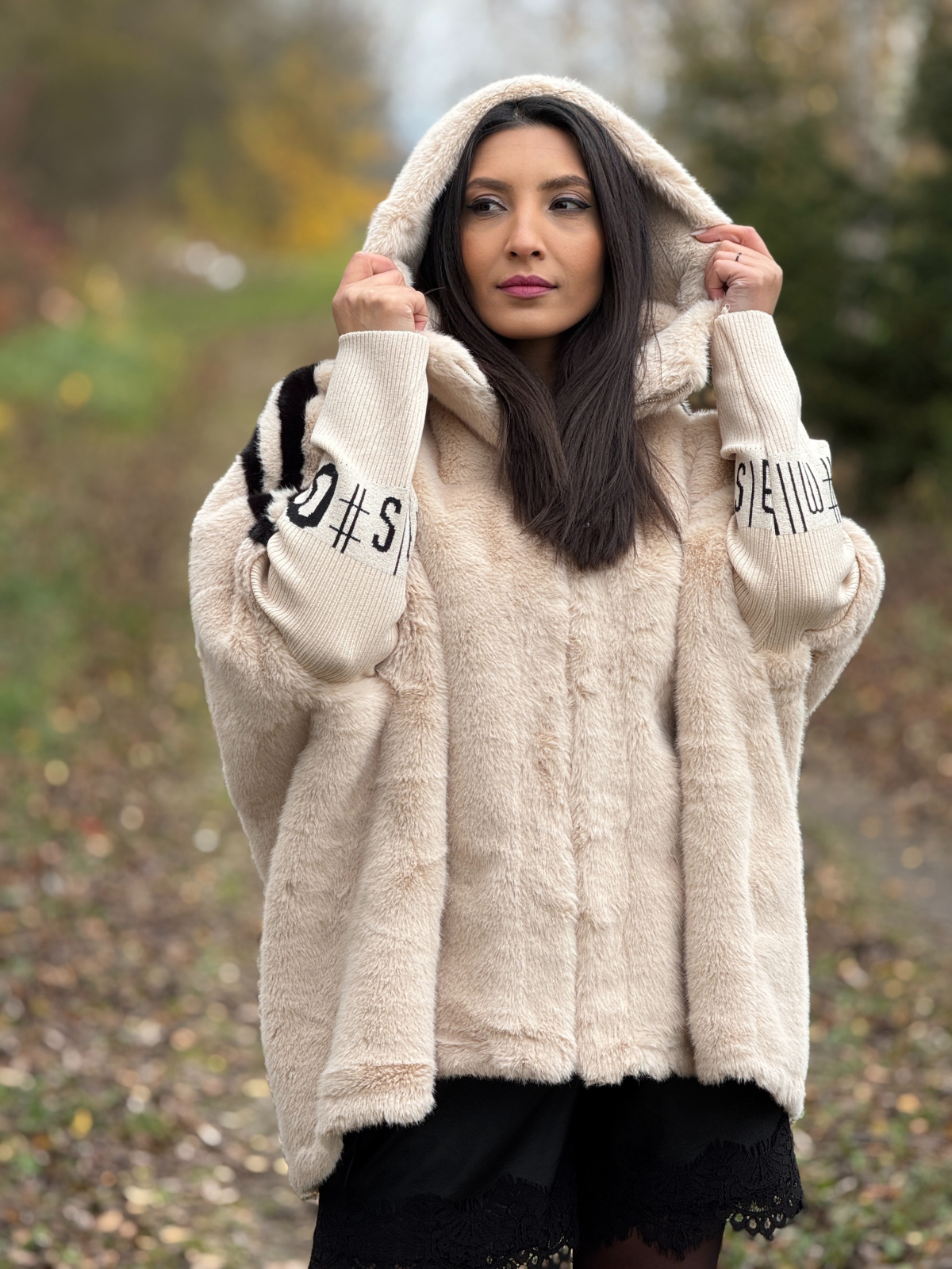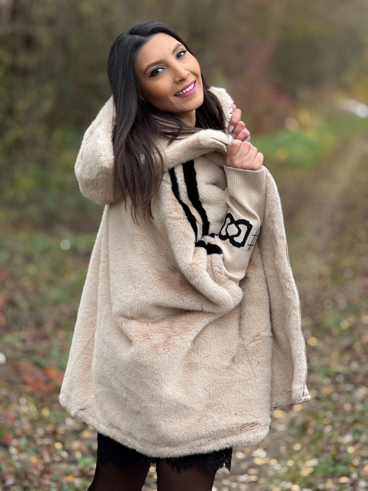 Haina din blană ecologică cu dungă pe mânecă este o piesă statement, care adaugă stil și căldură ținutelor de iarnă, fără a compromite confortul.