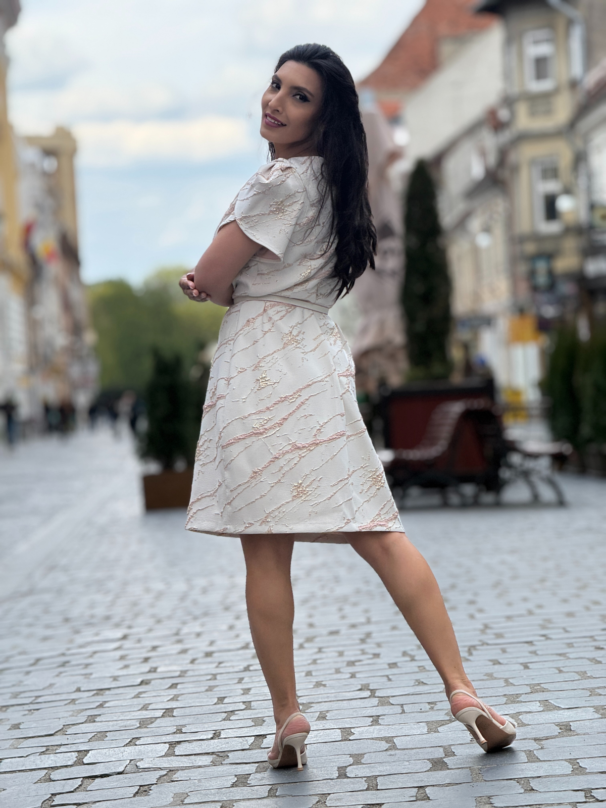Insertiile aurii și croiala cu curea în talie îți pun în evidență silueta, aducând un aer chic și modern.