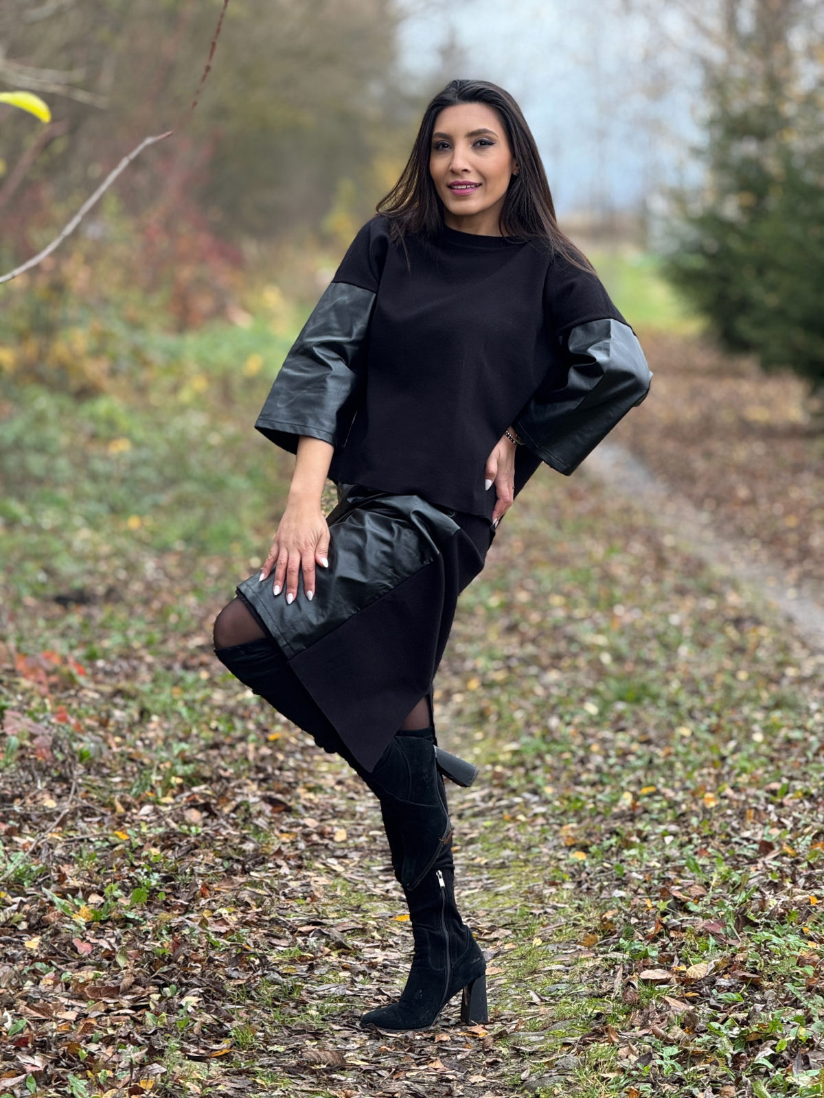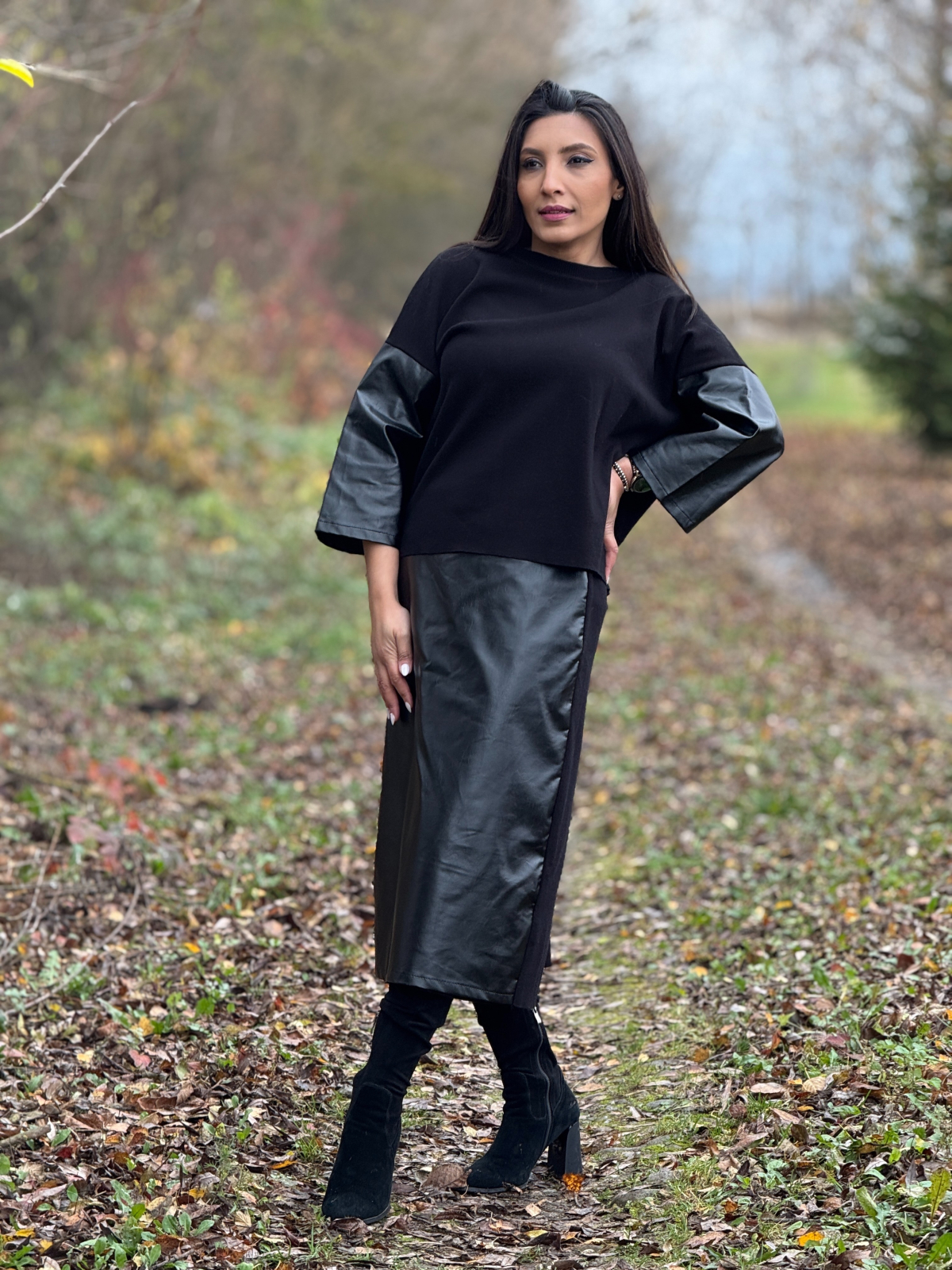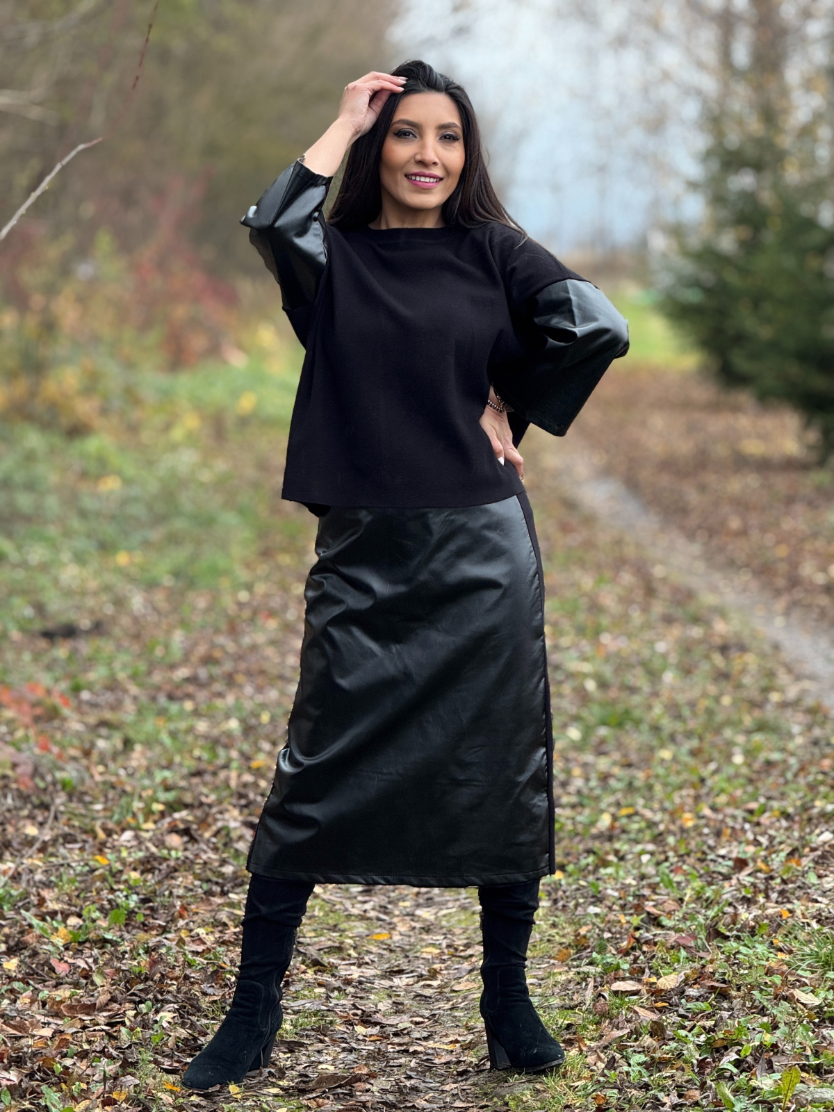 Compleul cu fustă din imitație de piele este o alegere stilistică puternică, dedicată femeilor care vor să îmbine confortul cu un look modern și sofisticat.