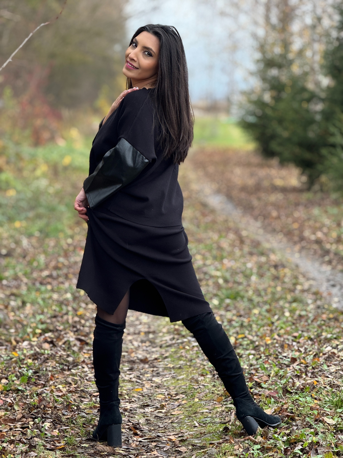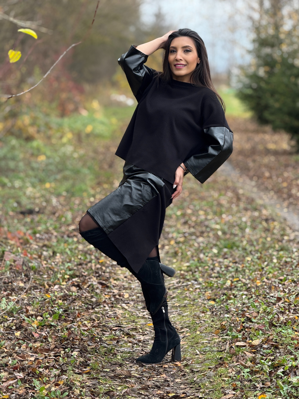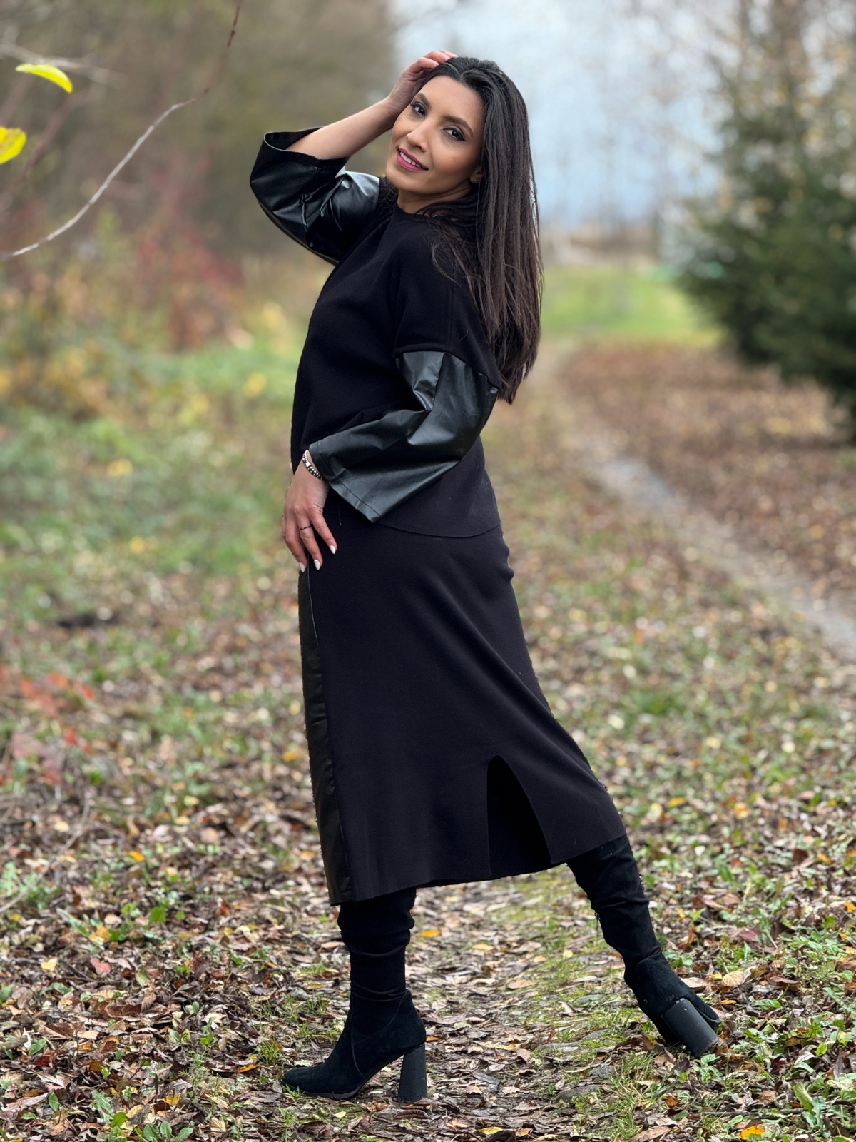 Compleul cu fustă din imitație de piele este o alegere stilistică puternică, dedicată femeilor care vor să îmbine confortul cu un look modern și sofisticat.