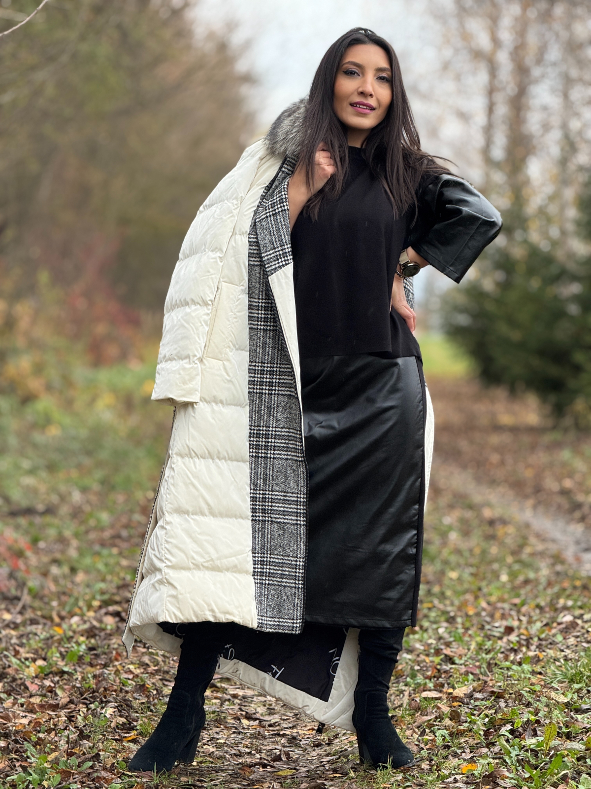 • Setul poate fi purtat cu cizme, botine sau pantofi cu toc, fiind ideal pentru ieșiri, evenimente sau întâlniri în oraș