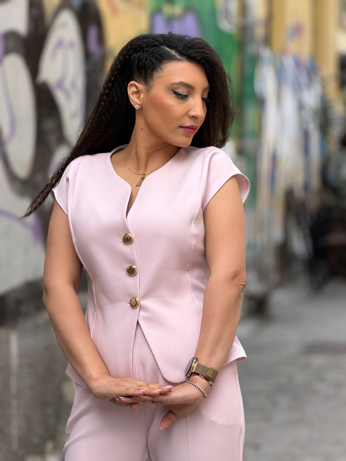 • Costum cu nasturi si umeri goi.