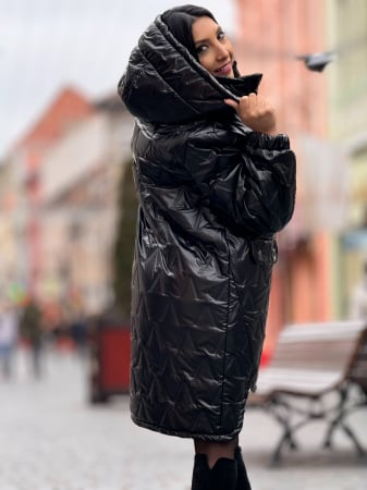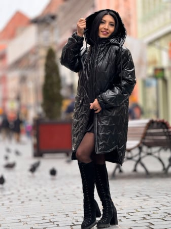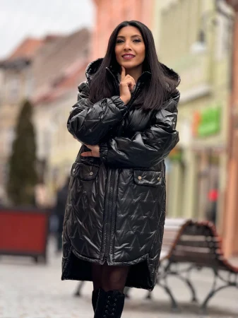 • Geaca neagră asimetrică matlasată este alegerea ideală pentru femeia care apreciază detaliile moderne și stilul rafinat.
