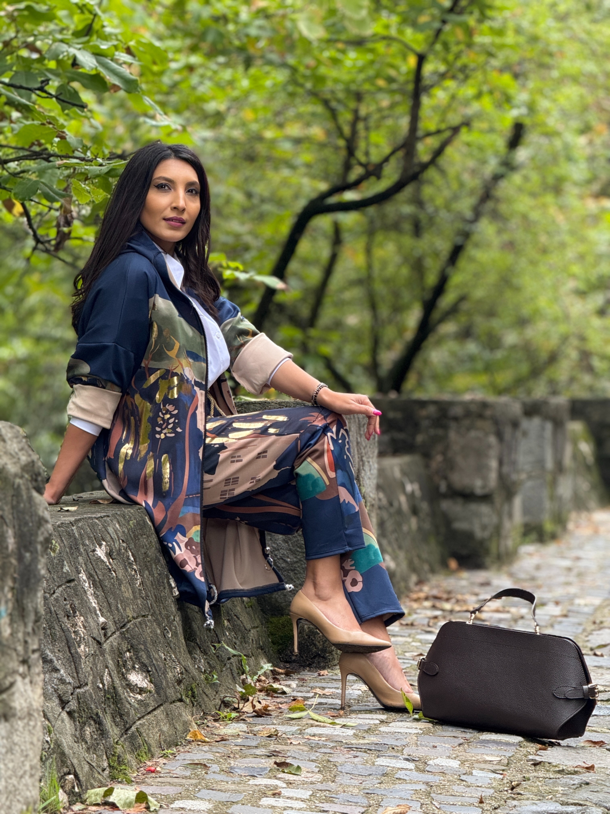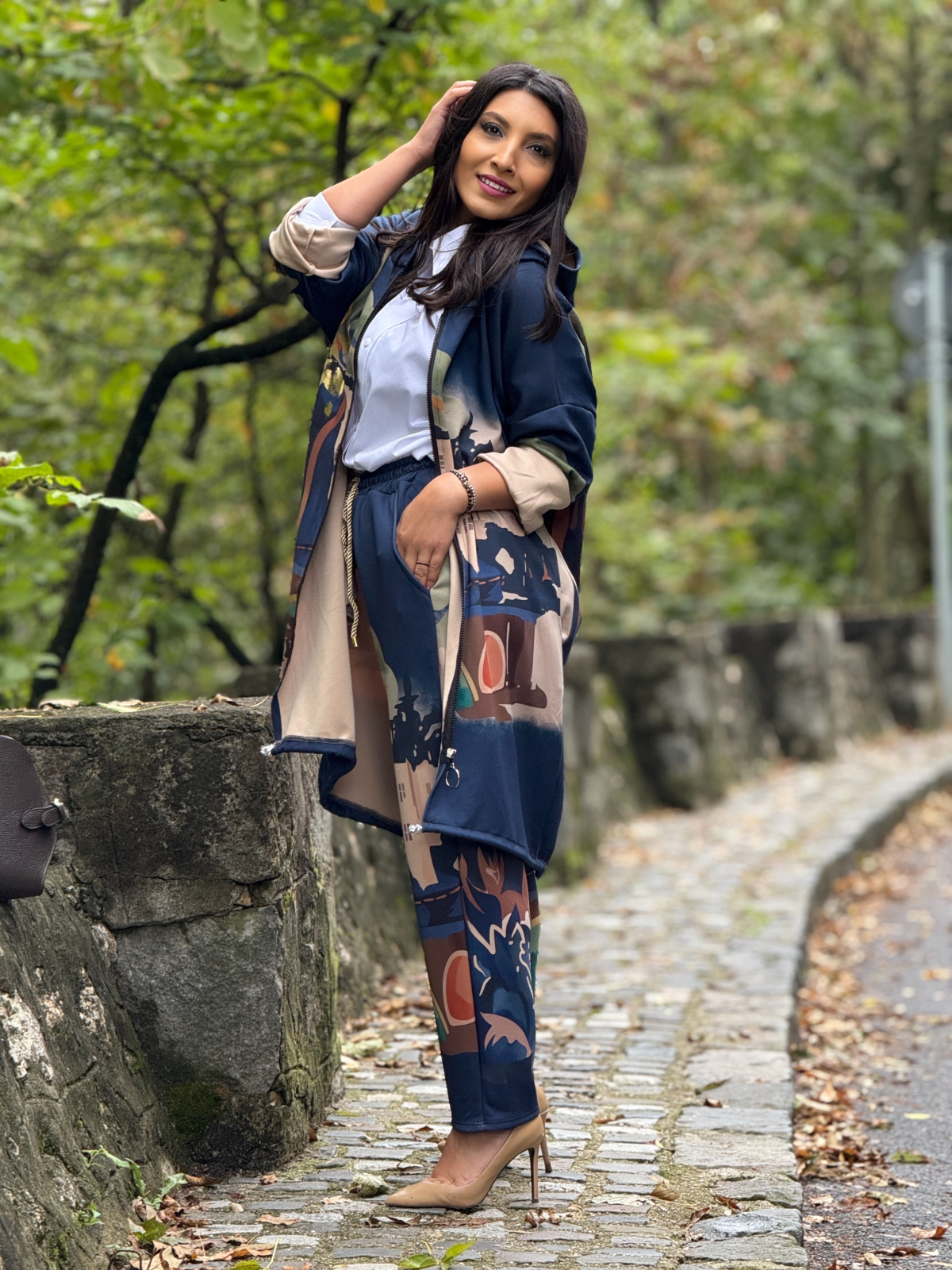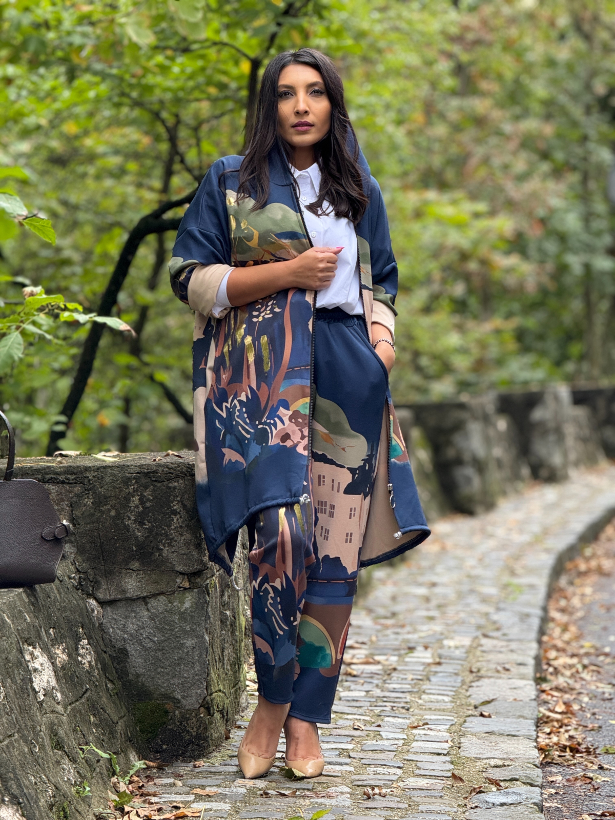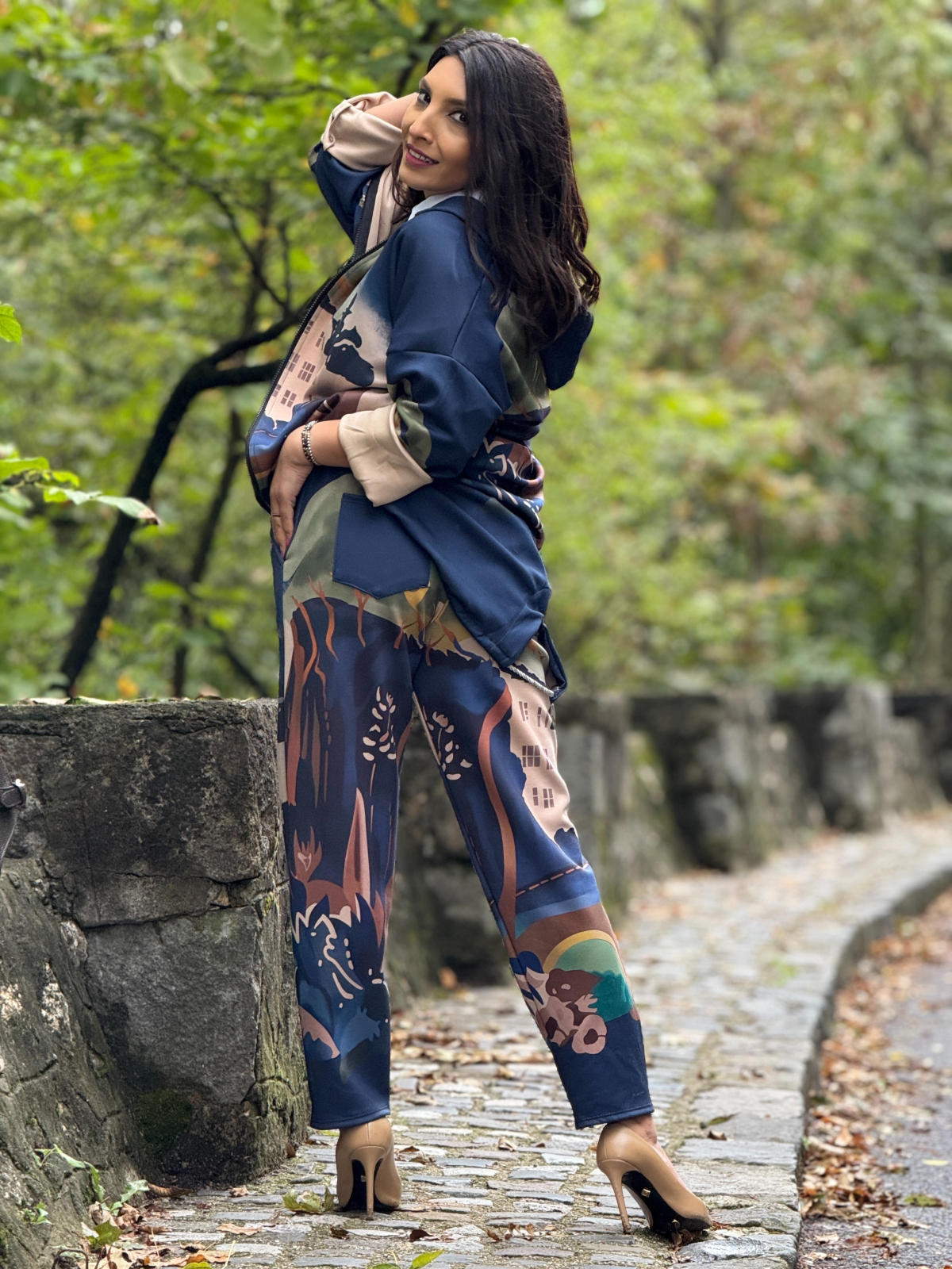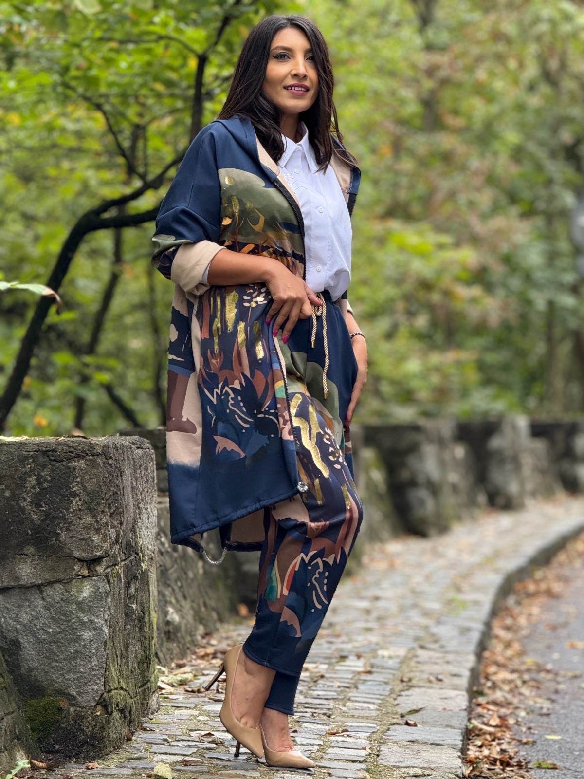 Pantaloni cu imprimeu artistic si accente aurii