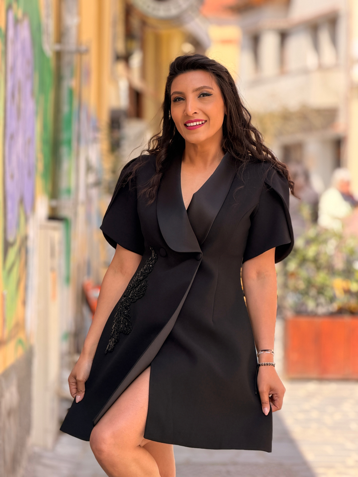 Experimentează libertatea și confortul de neegalat în această rochie tip sacou cu rever satinat, croită special pentru a-ți accentua feminitatea.