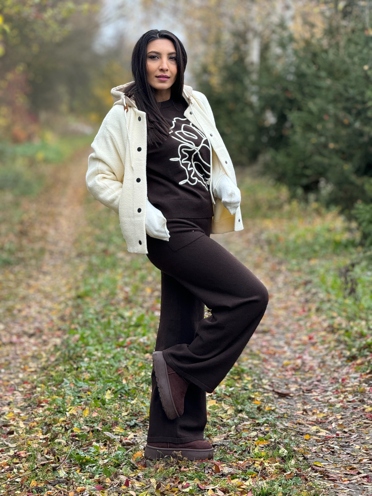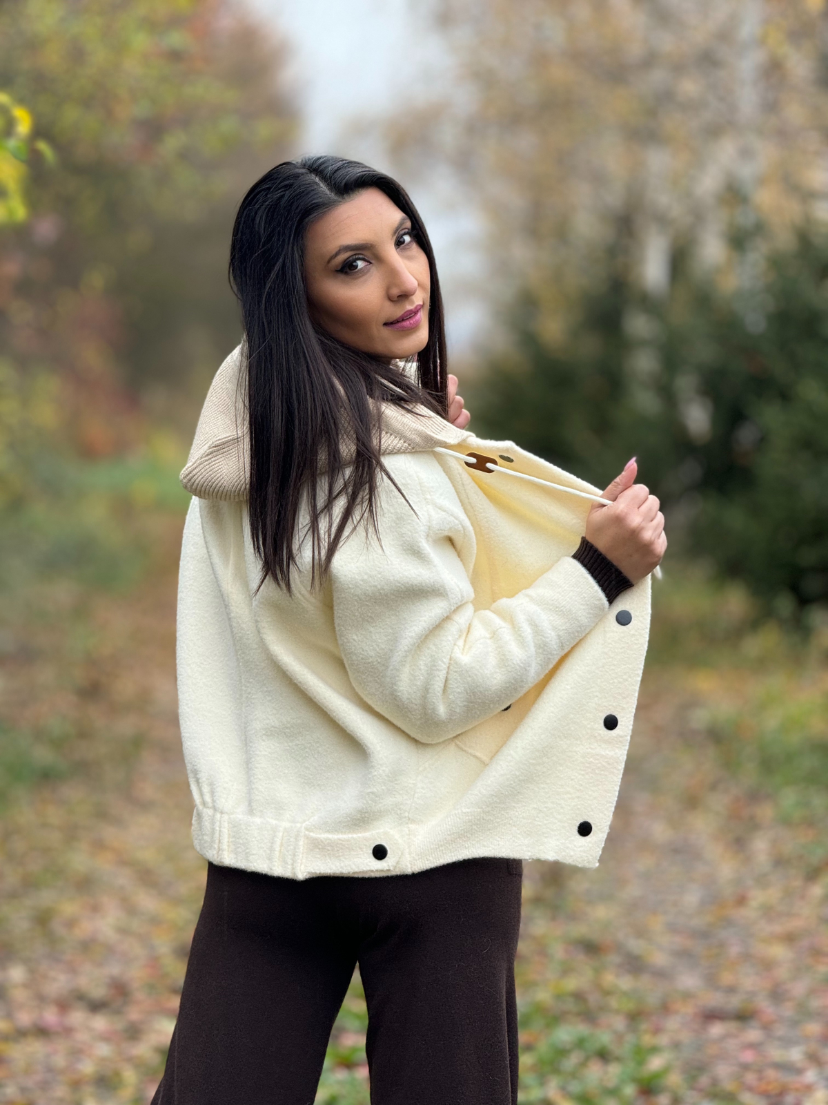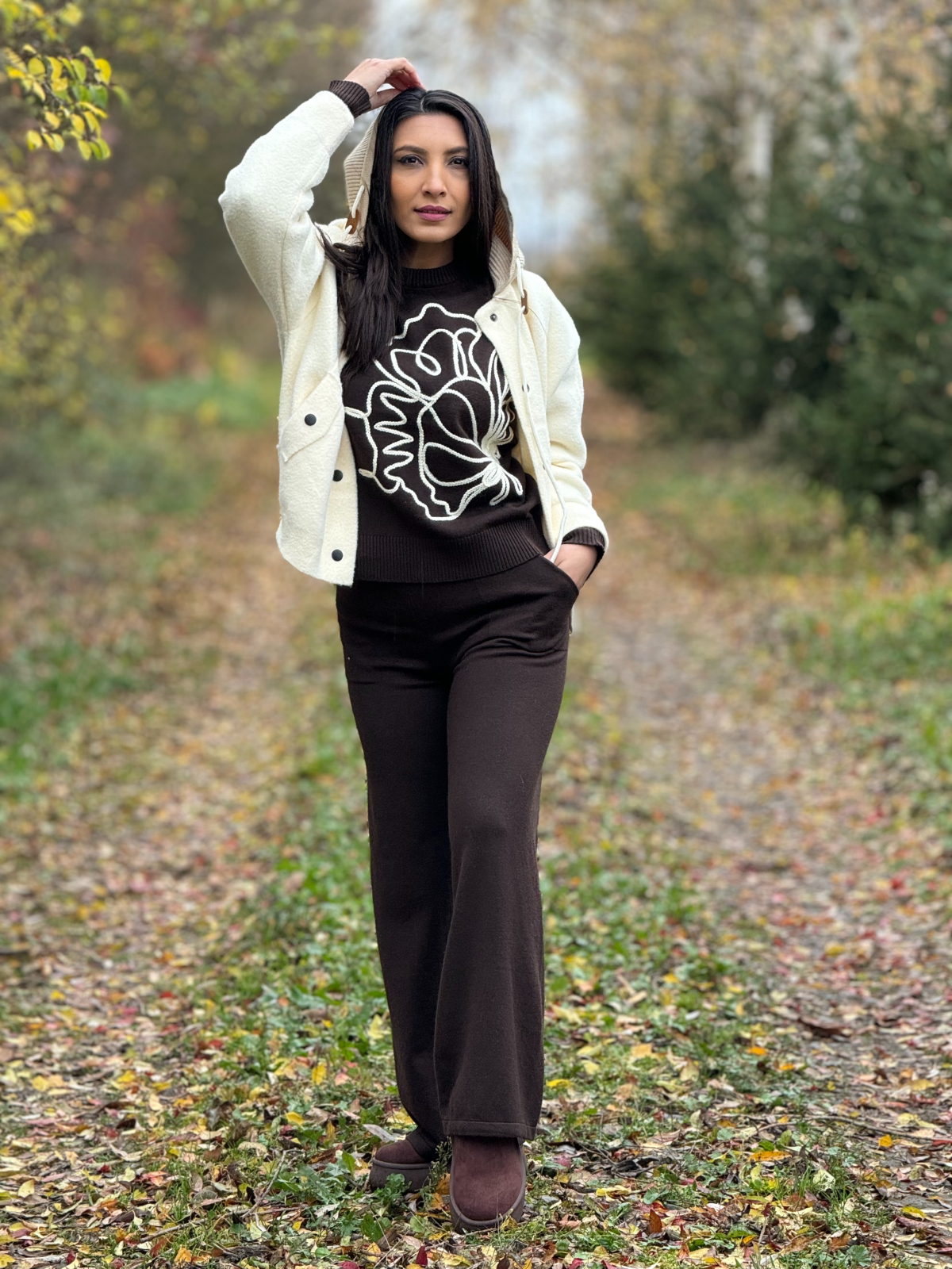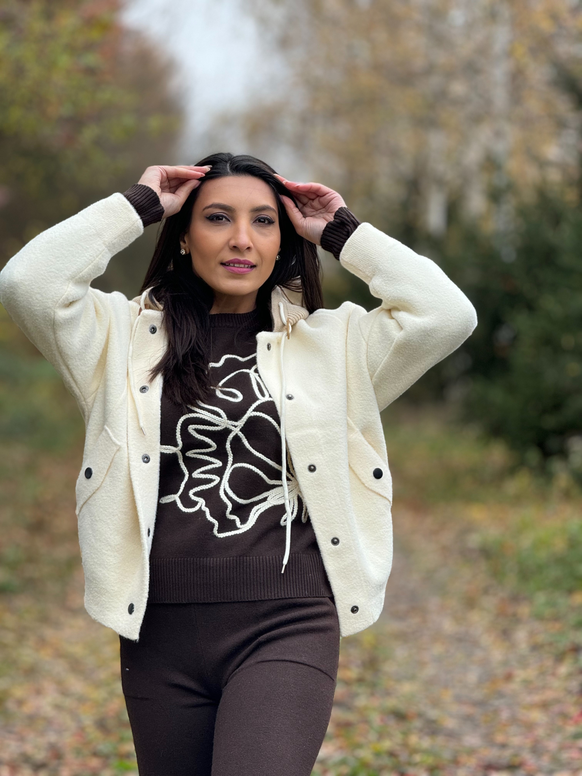 Jacheta cu nasturi negri și buzunare aplicate este o piesă clasică și funcțională, ideală pentru femeile care apreciază un design curat, bine proporționat și ușor de integrat în ținutele de zi cu zi.