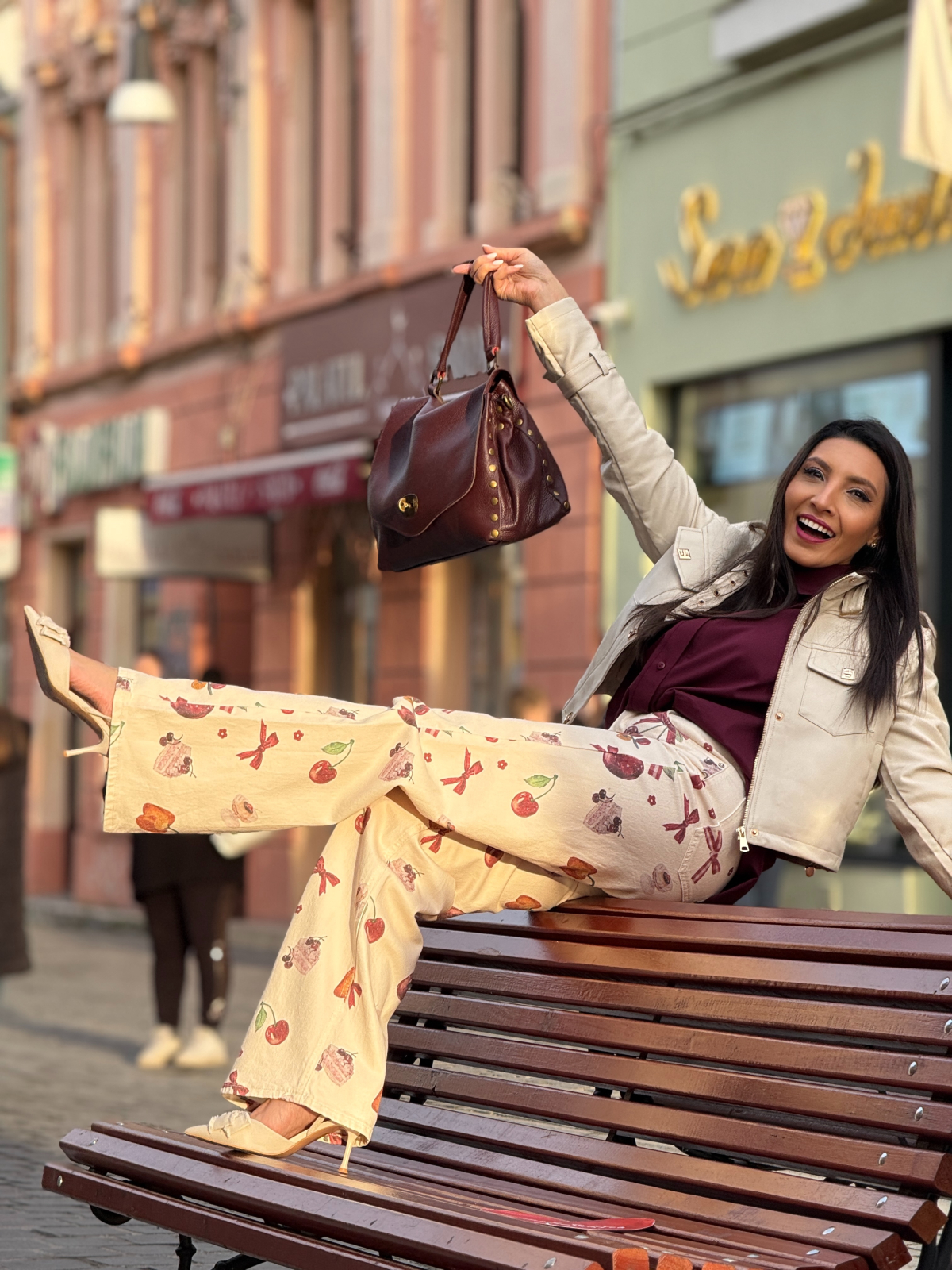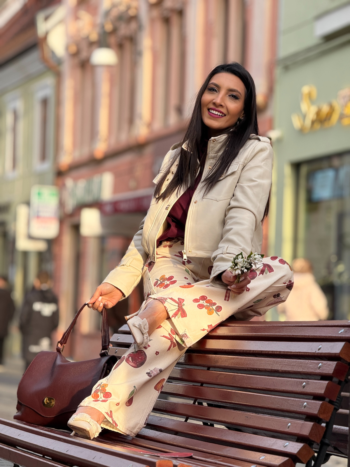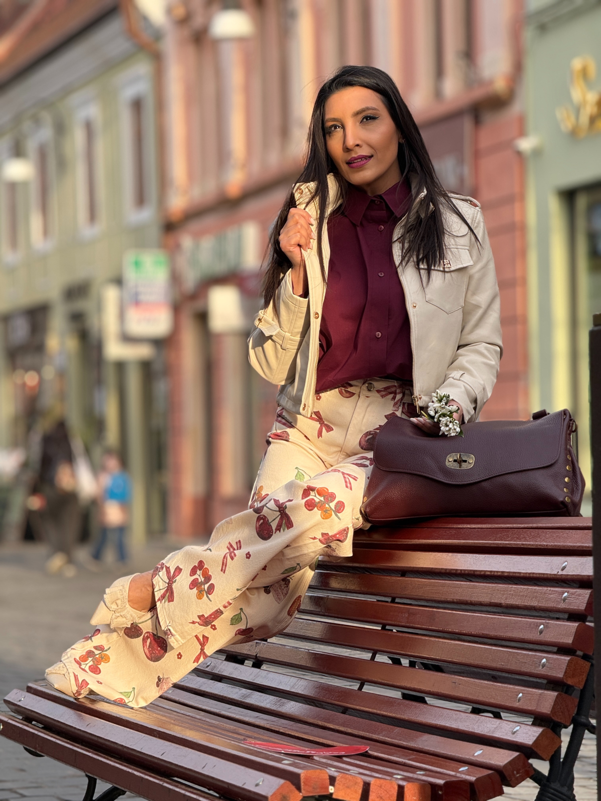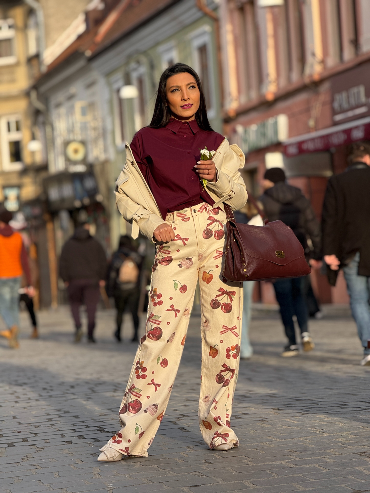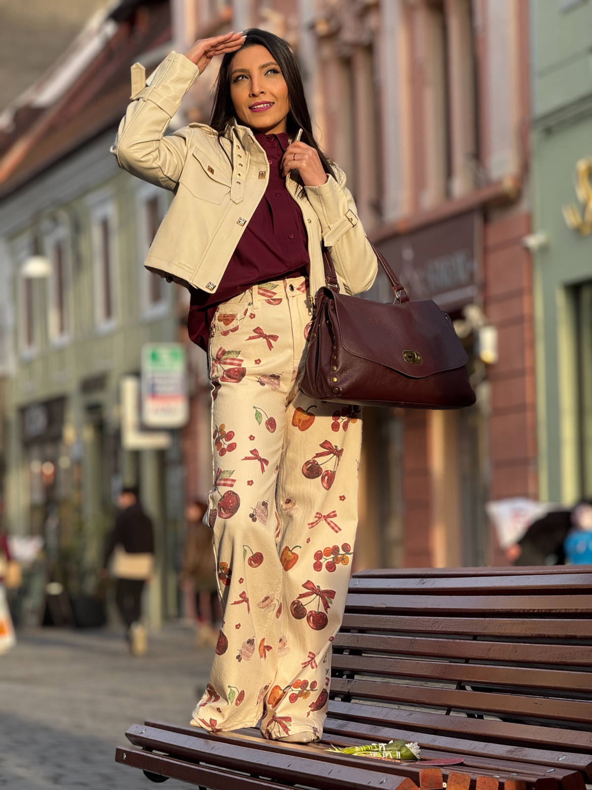 Blugi bej evazati cu imprimeu cirese