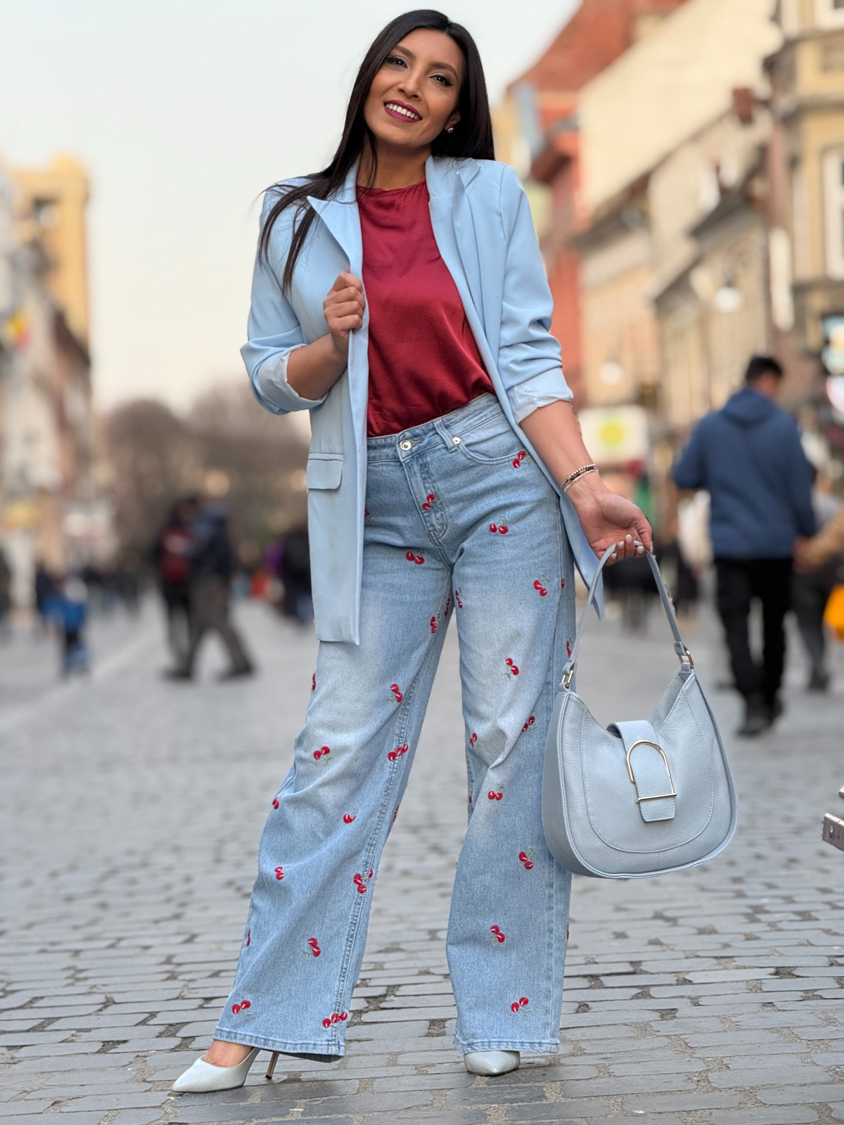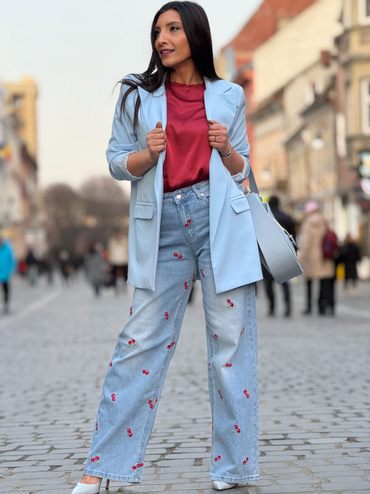 Blugi cu croi lejer si cirese brodate
