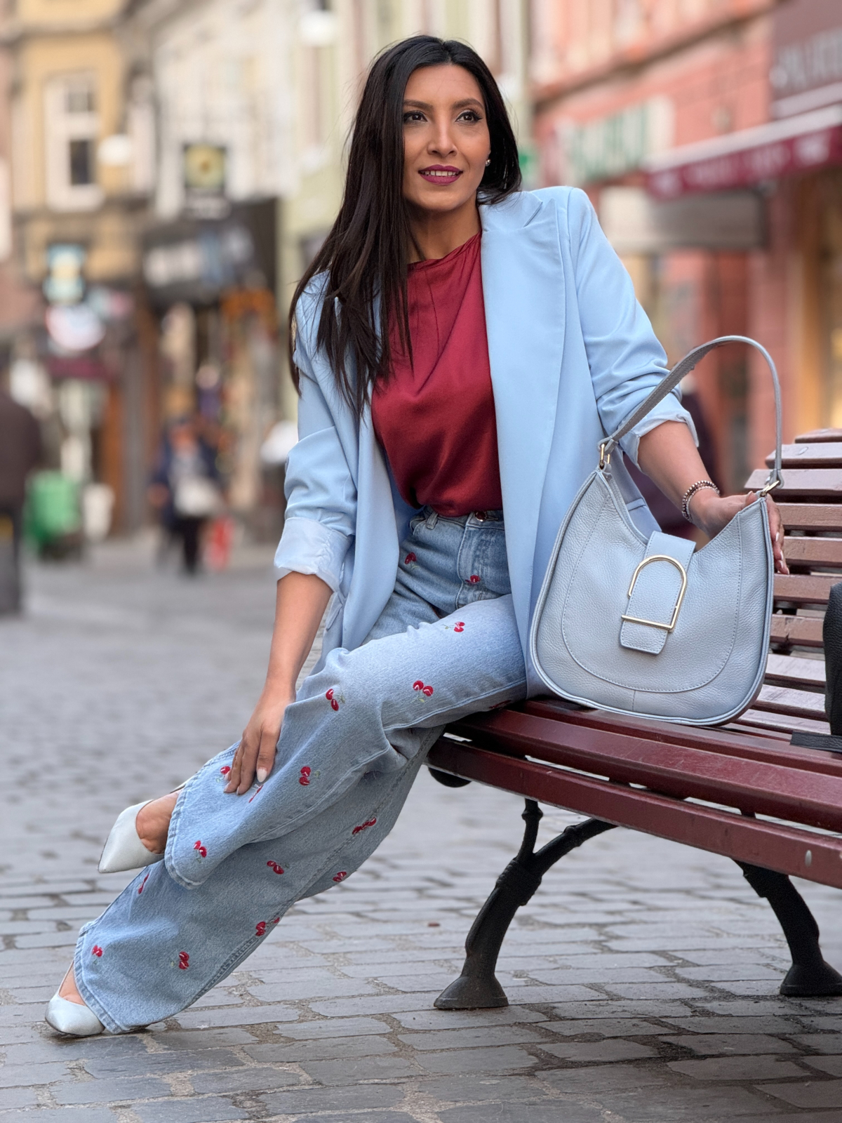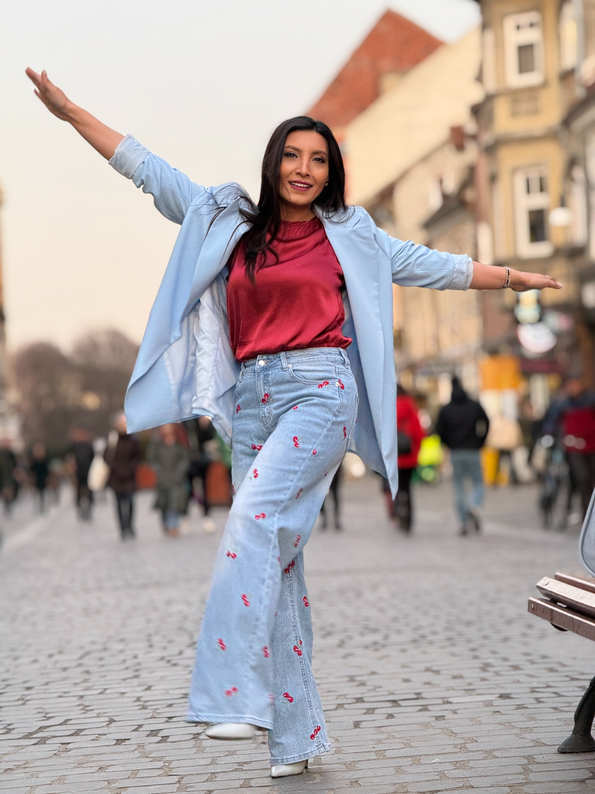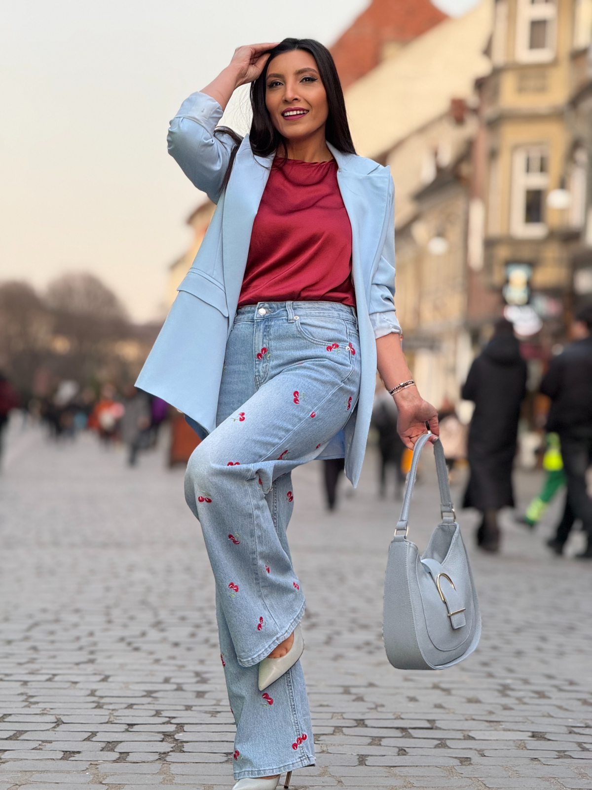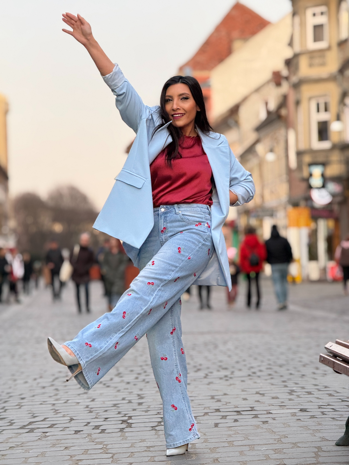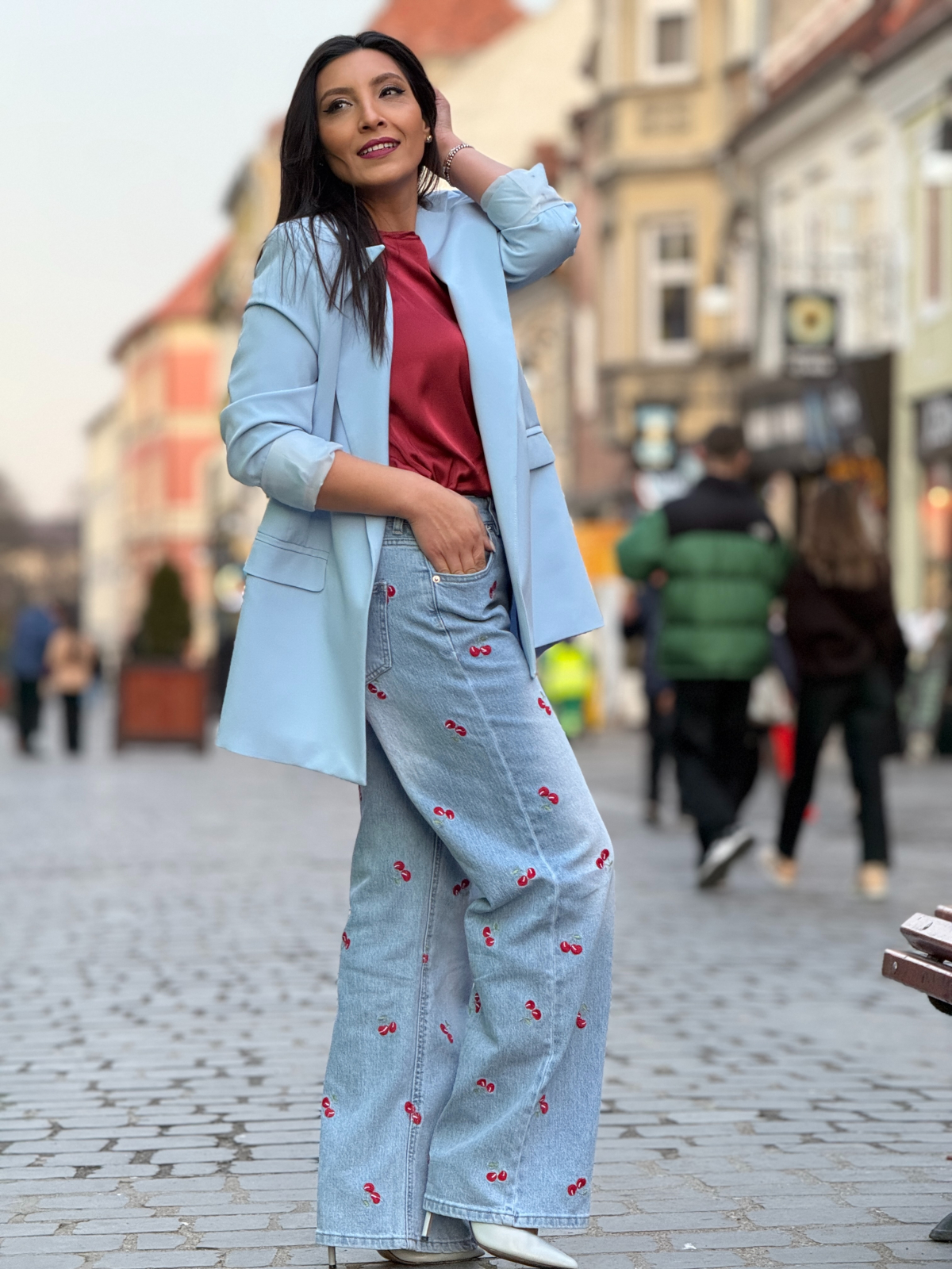 Bucură-te de libertate și confort cu acești blugi lejeri cu cireșe brodate. Încrederea ta va fi la cote maxime.