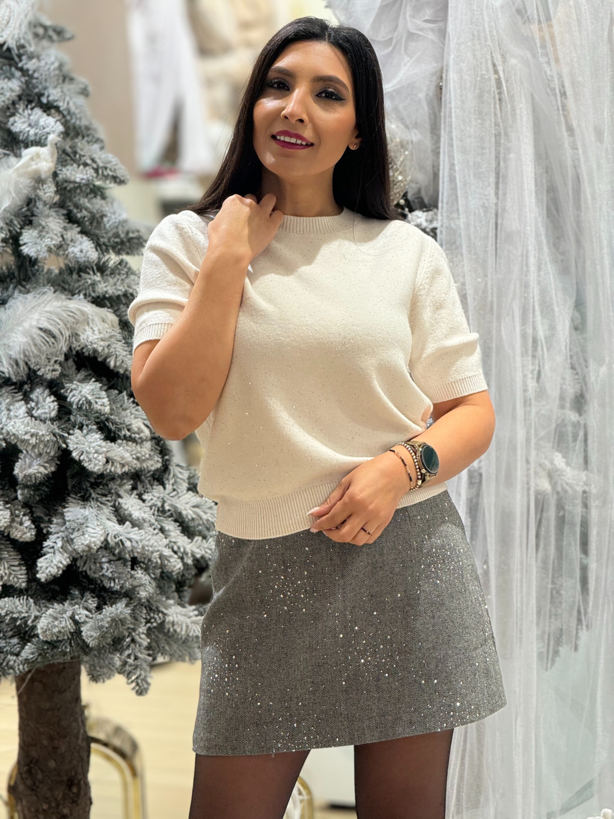Bluza cu sclipici și mânecă scurtă este o alegere feminină și versatilă, perfectă pentru a adăuga un strop de strălucire discretă oricărei ținute.