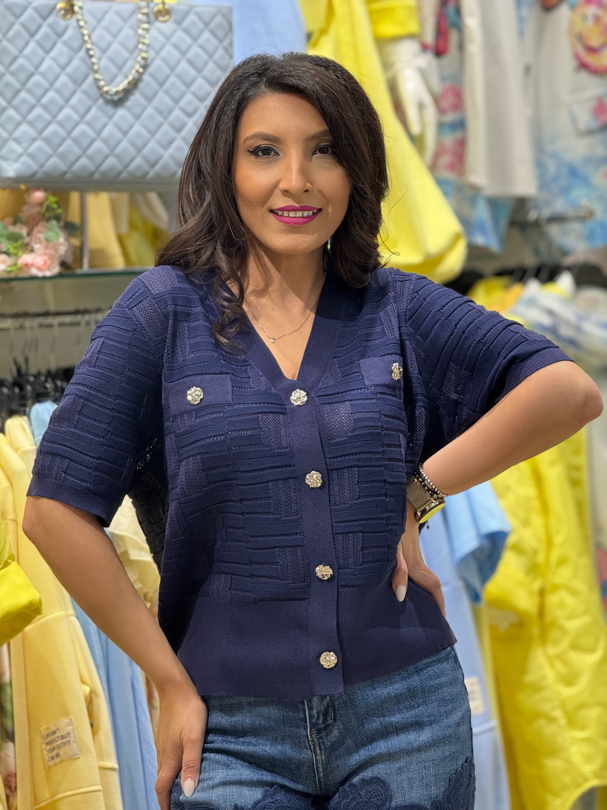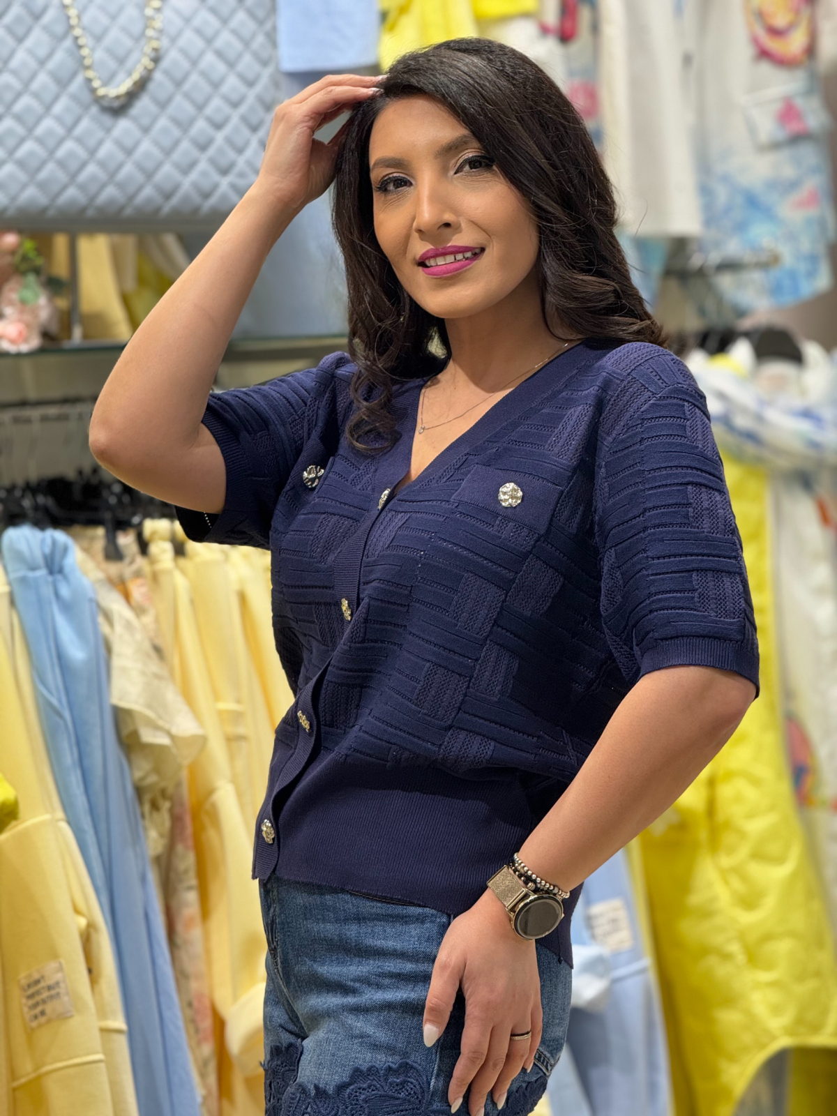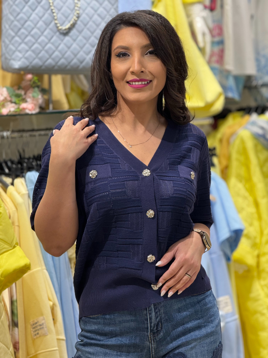 Simte-te libera si confortabila in aceasta bluza tricotata cu decolteu in V si detalii de nasturi ce aduc un plus de eleganta.