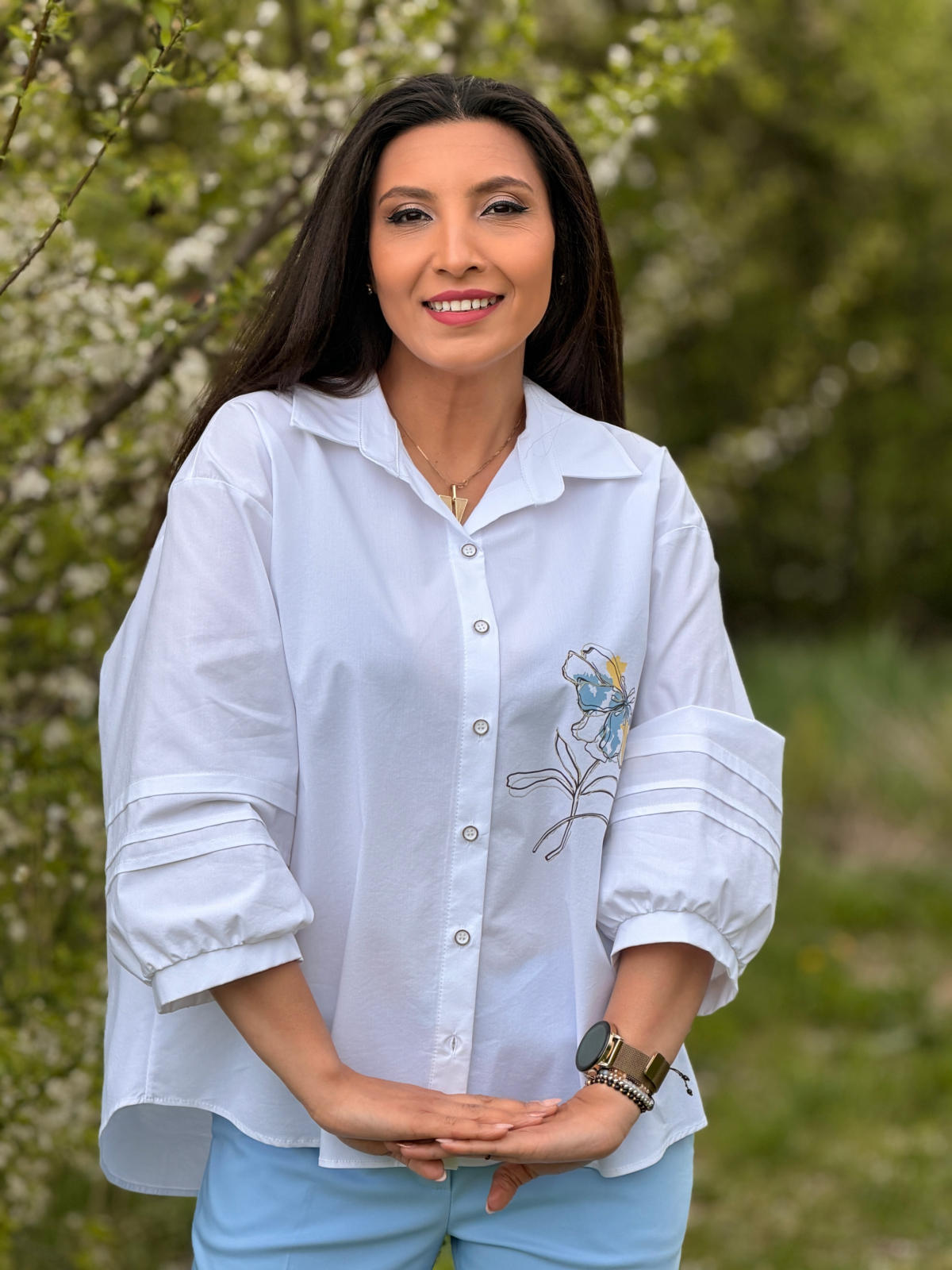 Nasturii inserati discret și broderia florală adaugă un plus de rafinament acestei piese vestimentare esențiale. Te vei simți atât confortabilă, cât și stilată în orice moment al zilei.