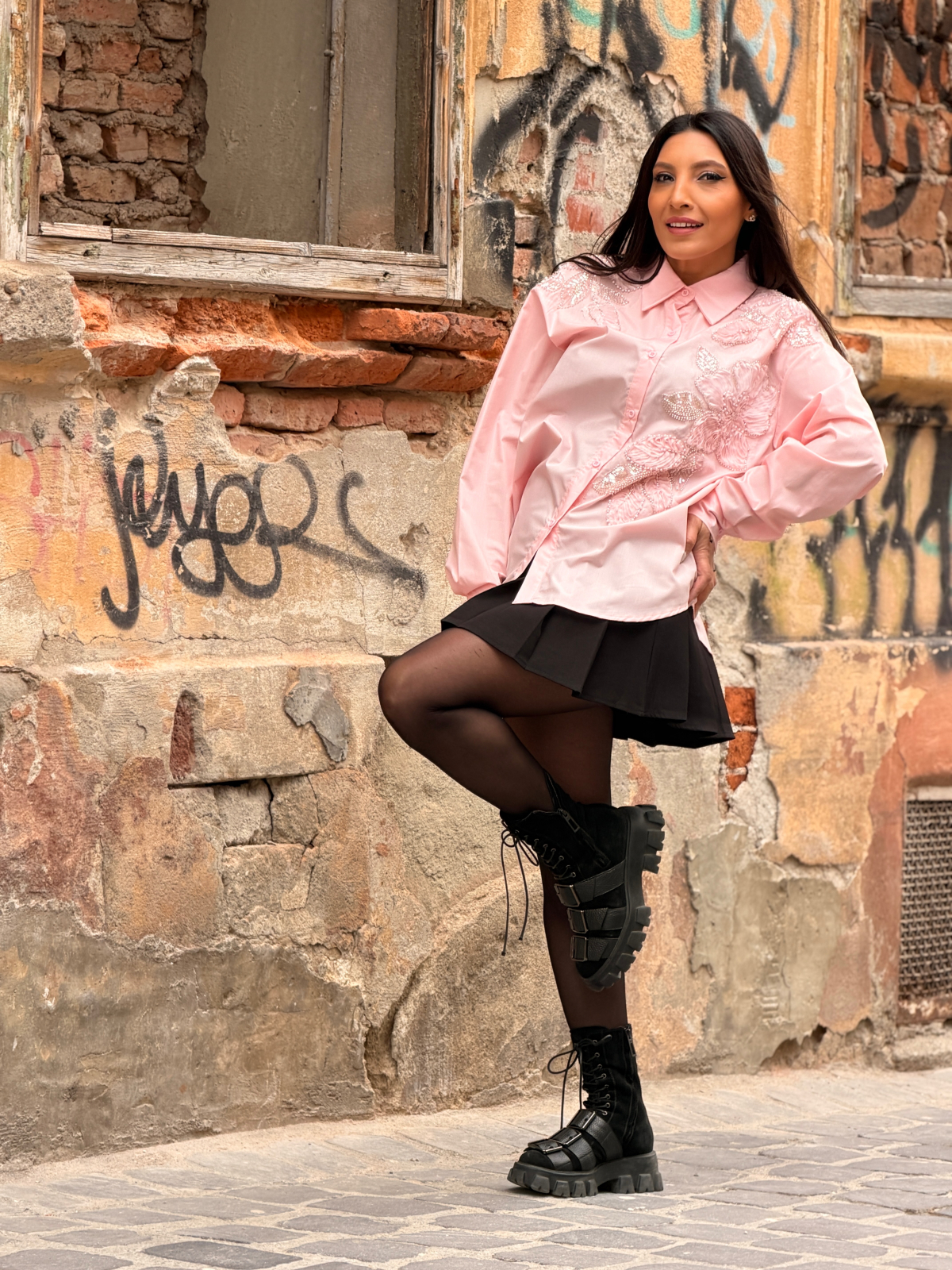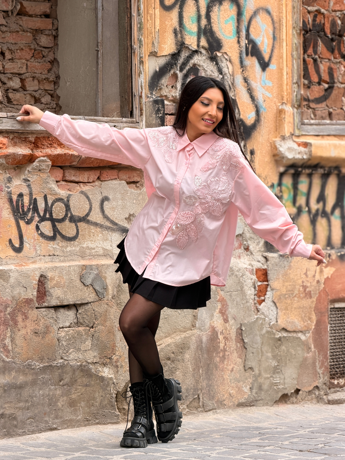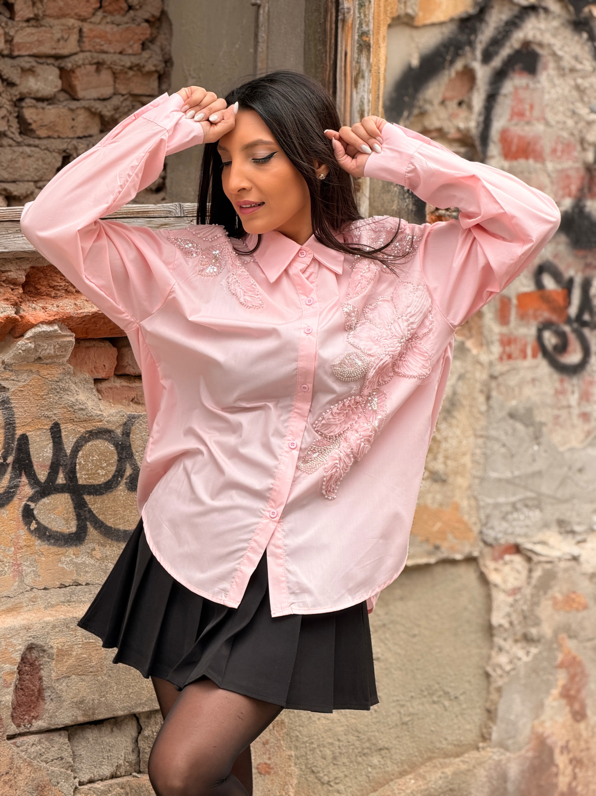 Camasa cu aplicatii florale brodate cu perle si paiete