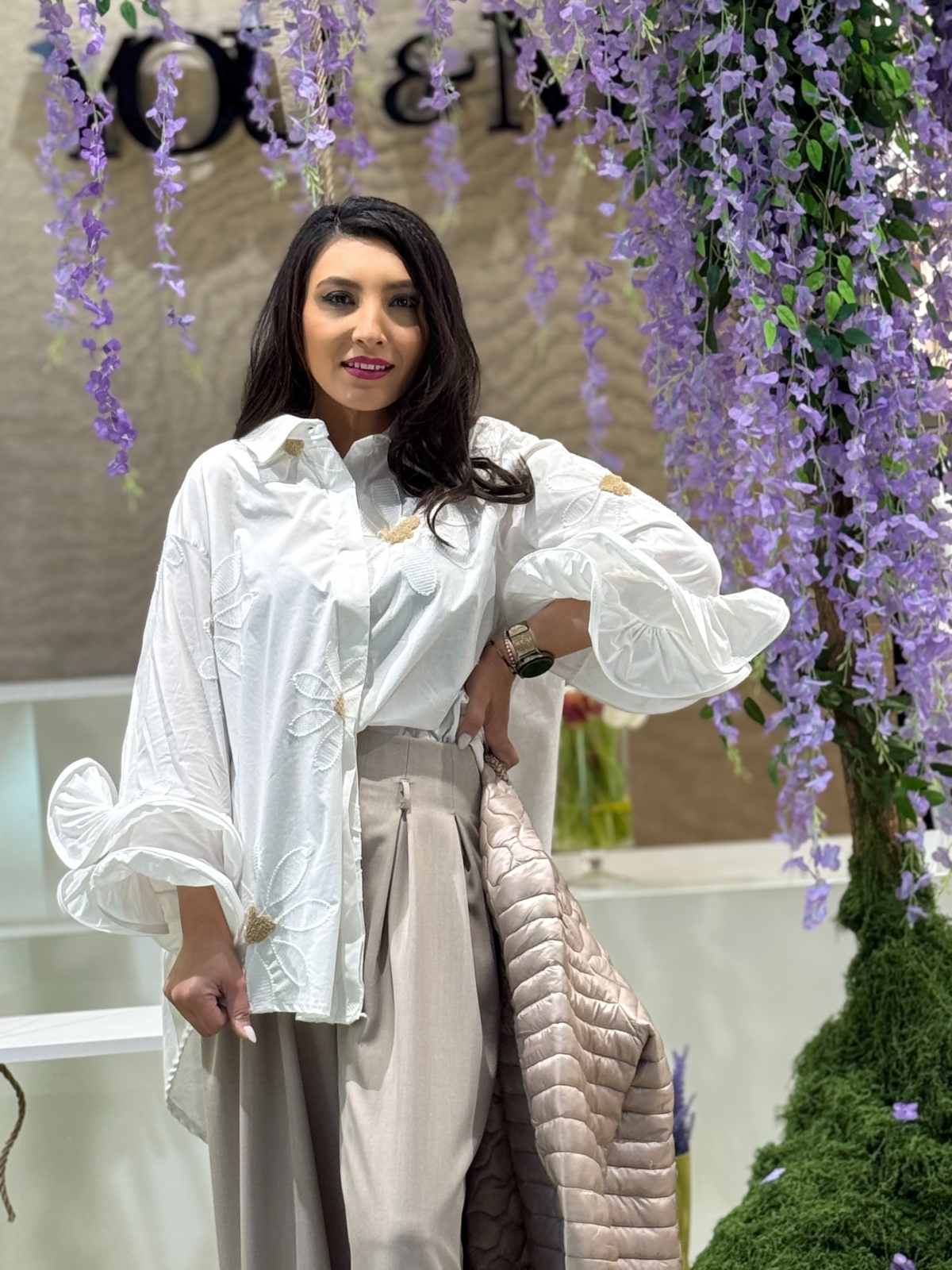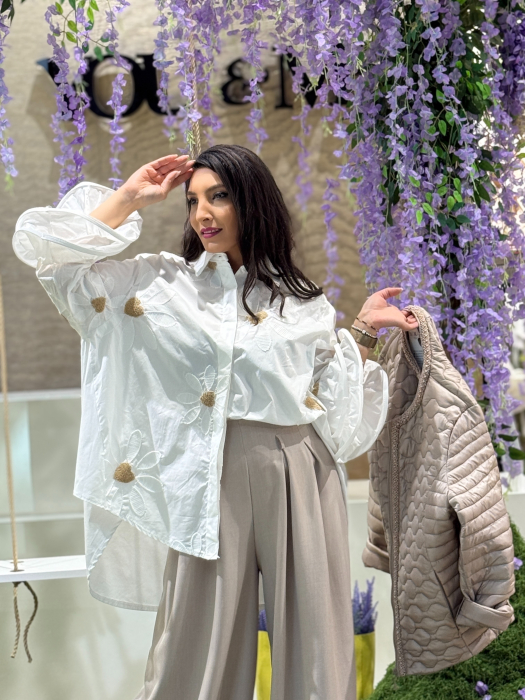 Camasa din bumbac cu maneca cu volane si flori aplicate