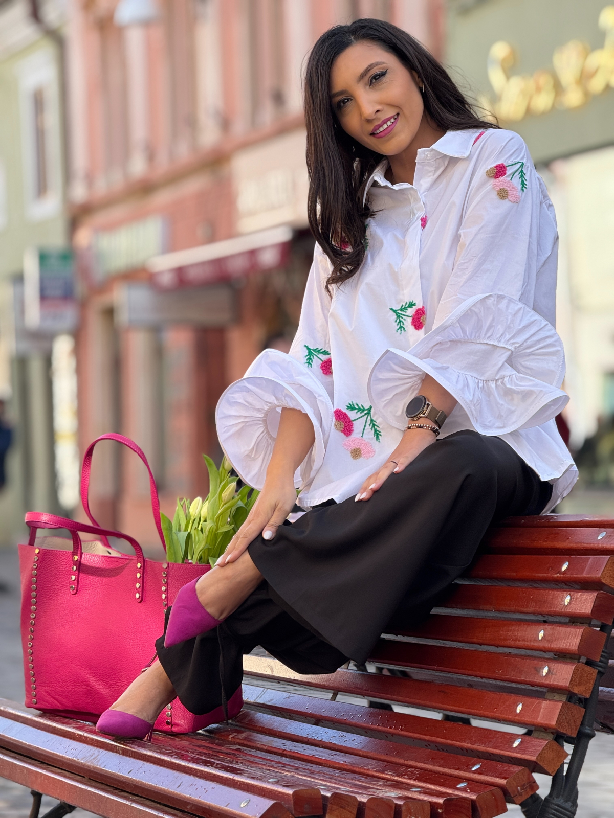Cămașa din bumbac cu mânecă spectaculoasă și floricele brodate roz îți aduce un suflu proaspăt și elegant. Libertatea și confortul acestei cămăși te fac să te simți în largul tău, în orice moment al zilei.