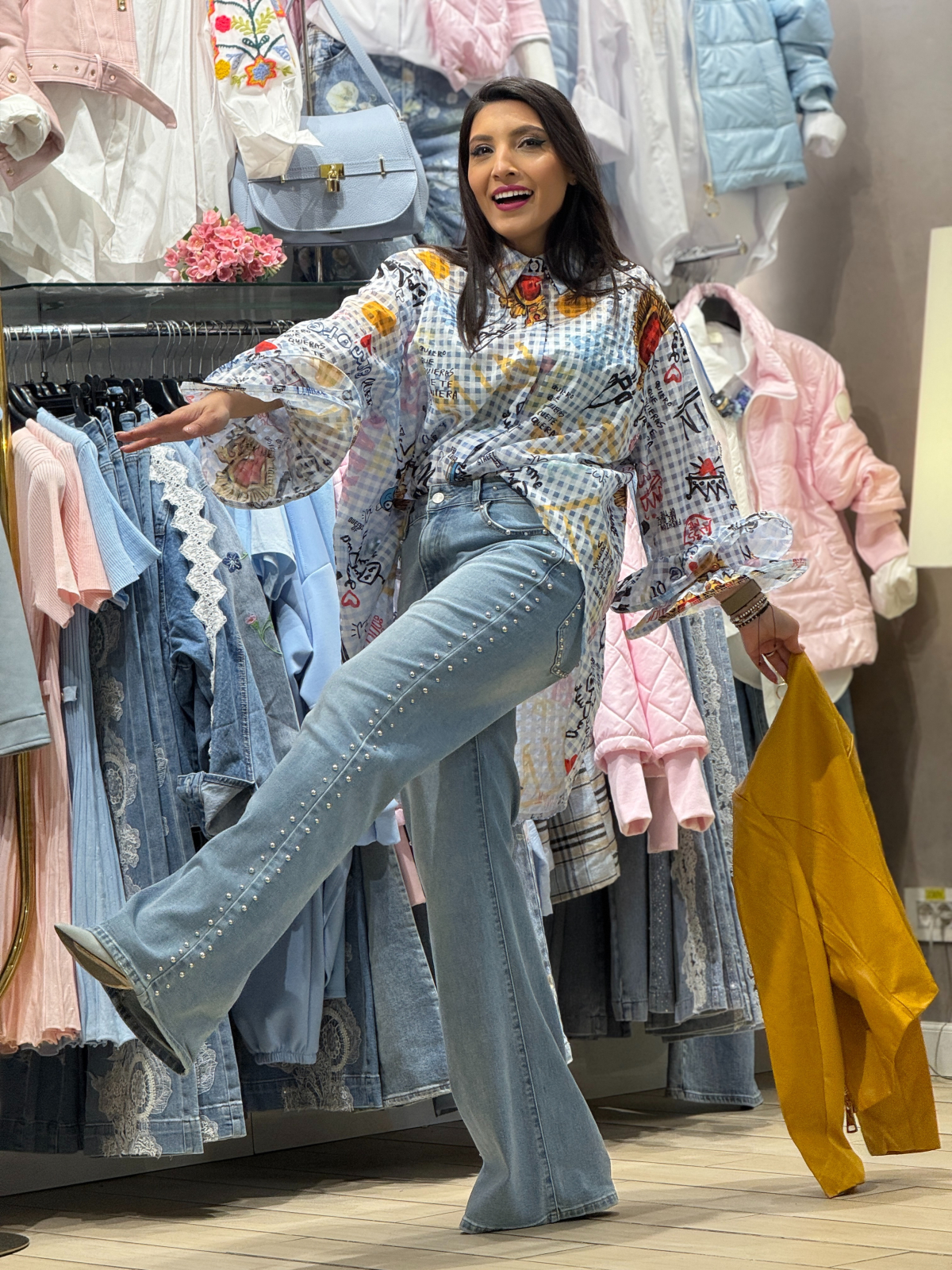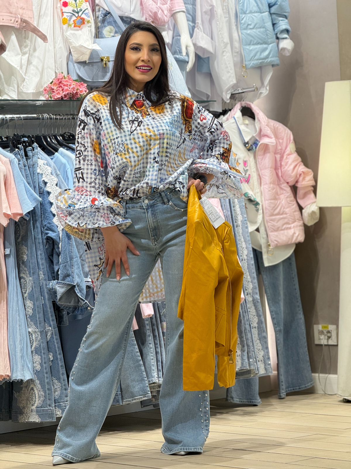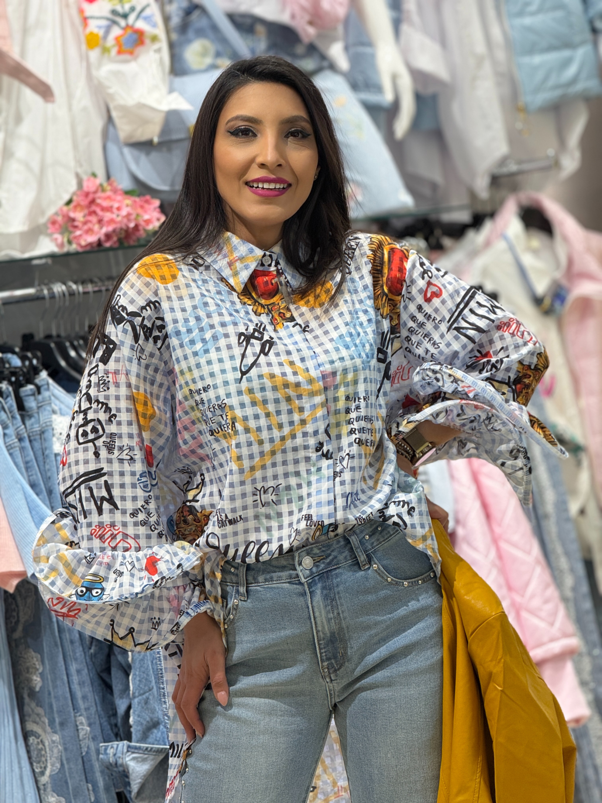 Imprimeul artistic cu carouri și inserții grafice adaugă un plus de originalitate și modernitate, transformând această cămașă într-o piesă de senzație.