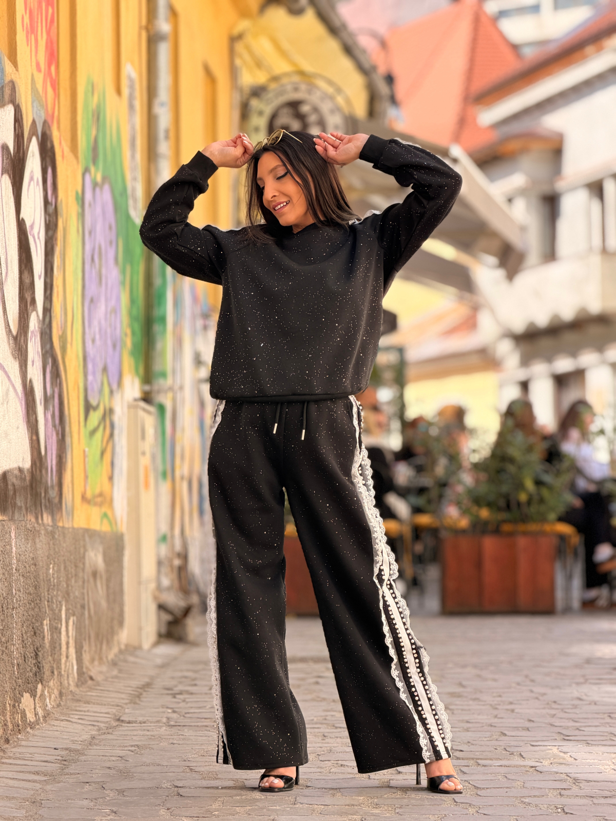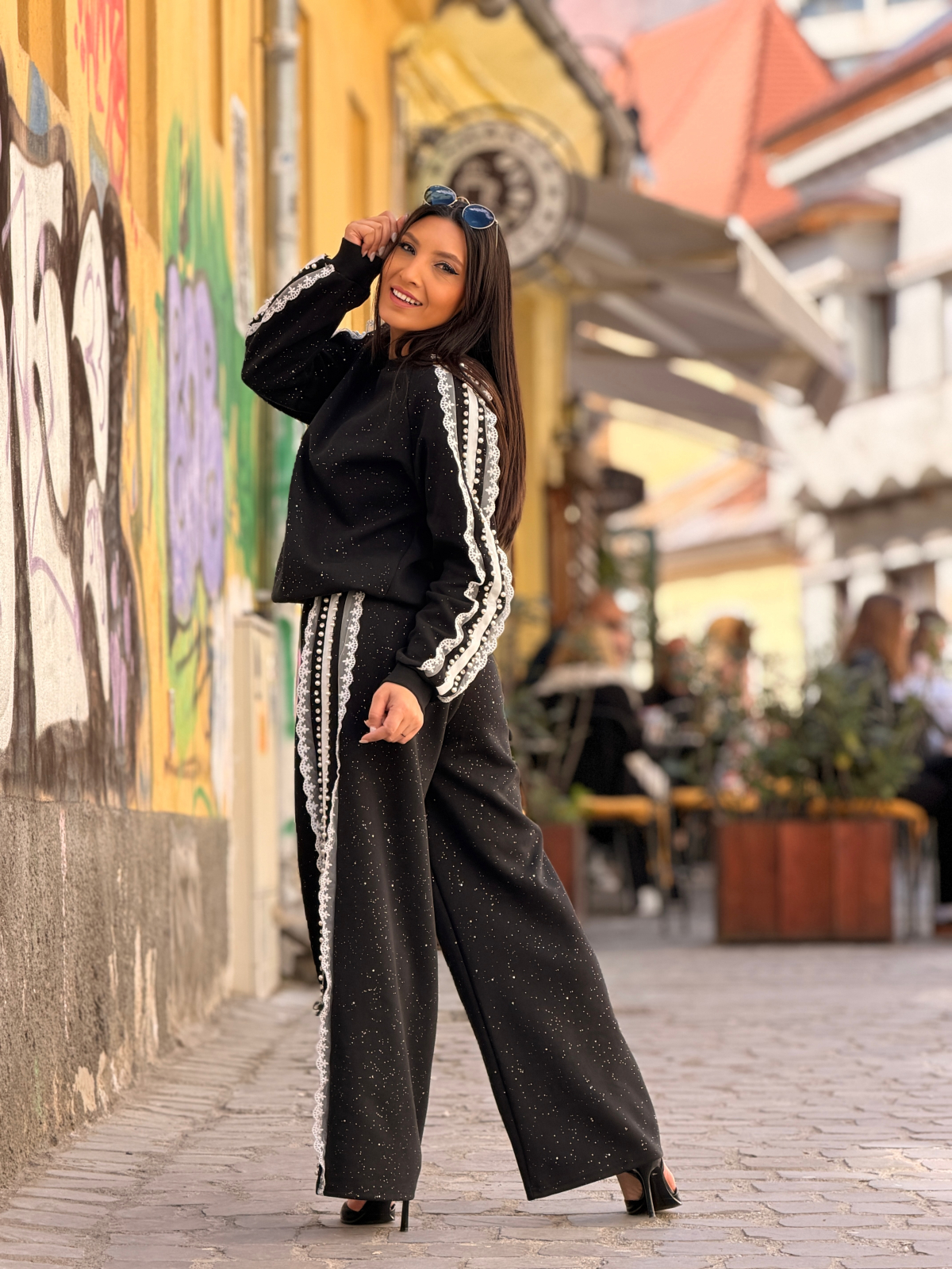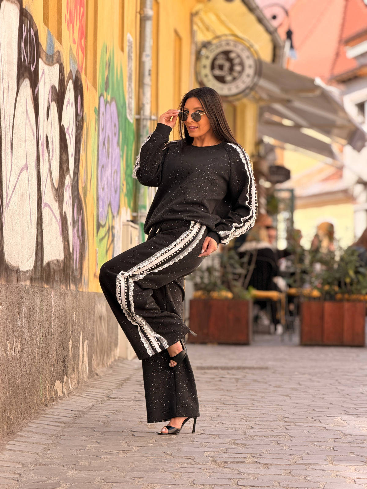 Compleu cu insertii si aplicatii decorative din dantela si perle
