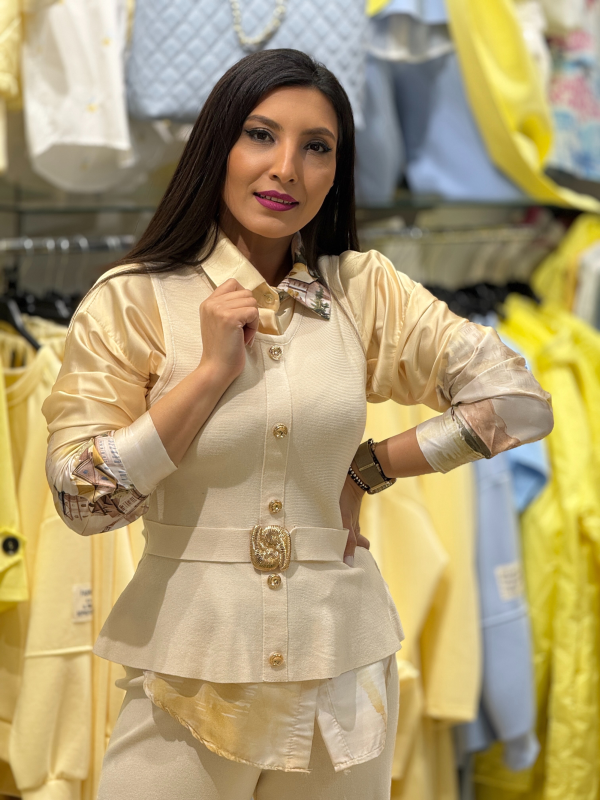 Simte eleganța și încrederea pe care ți le oferă acest compleu. Nasturii decorativi aduc un plus de rafinament, iar curea în talie subliniază frumos silueta ta.