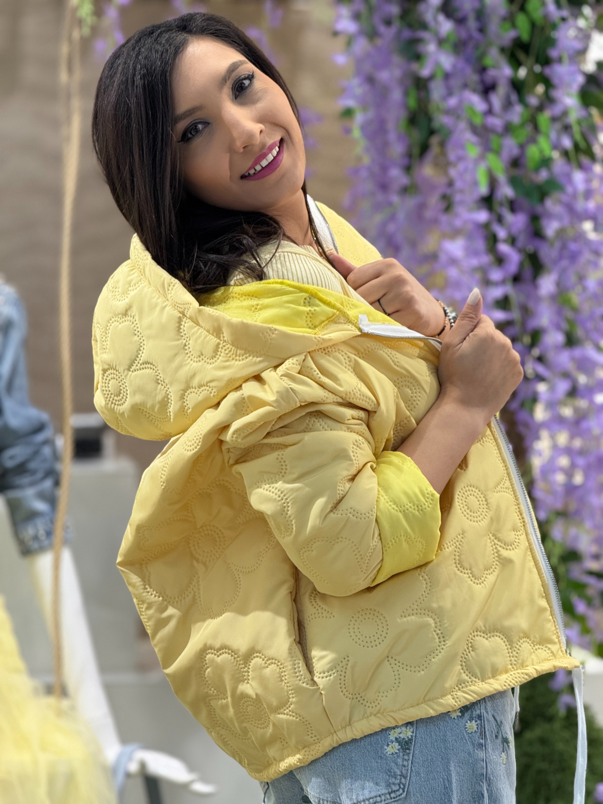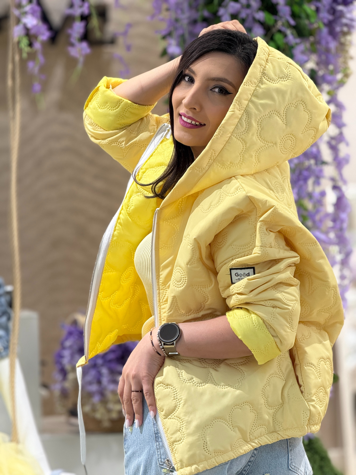 • Geacă matlasată cu glugă și fermoar frontal.