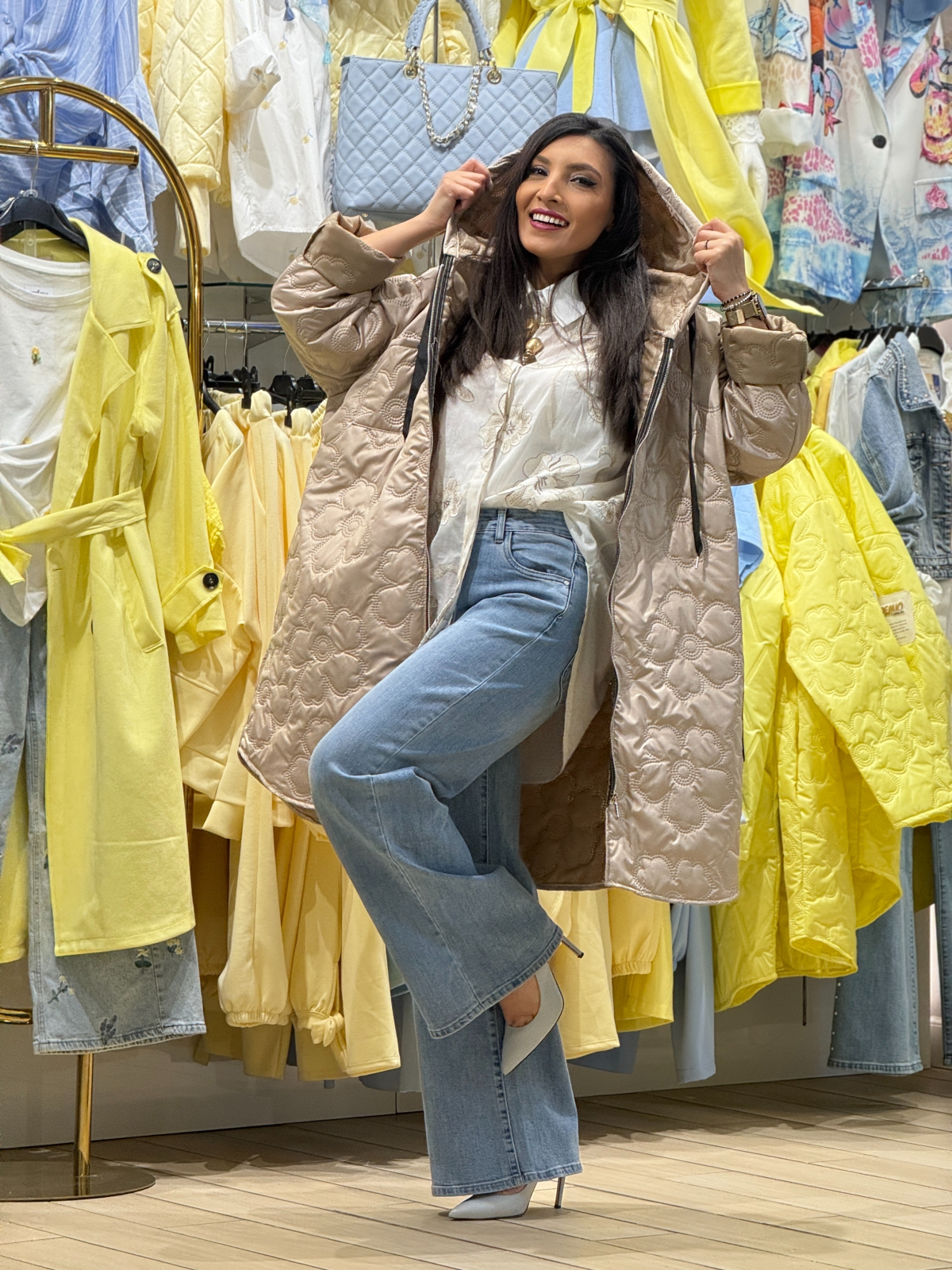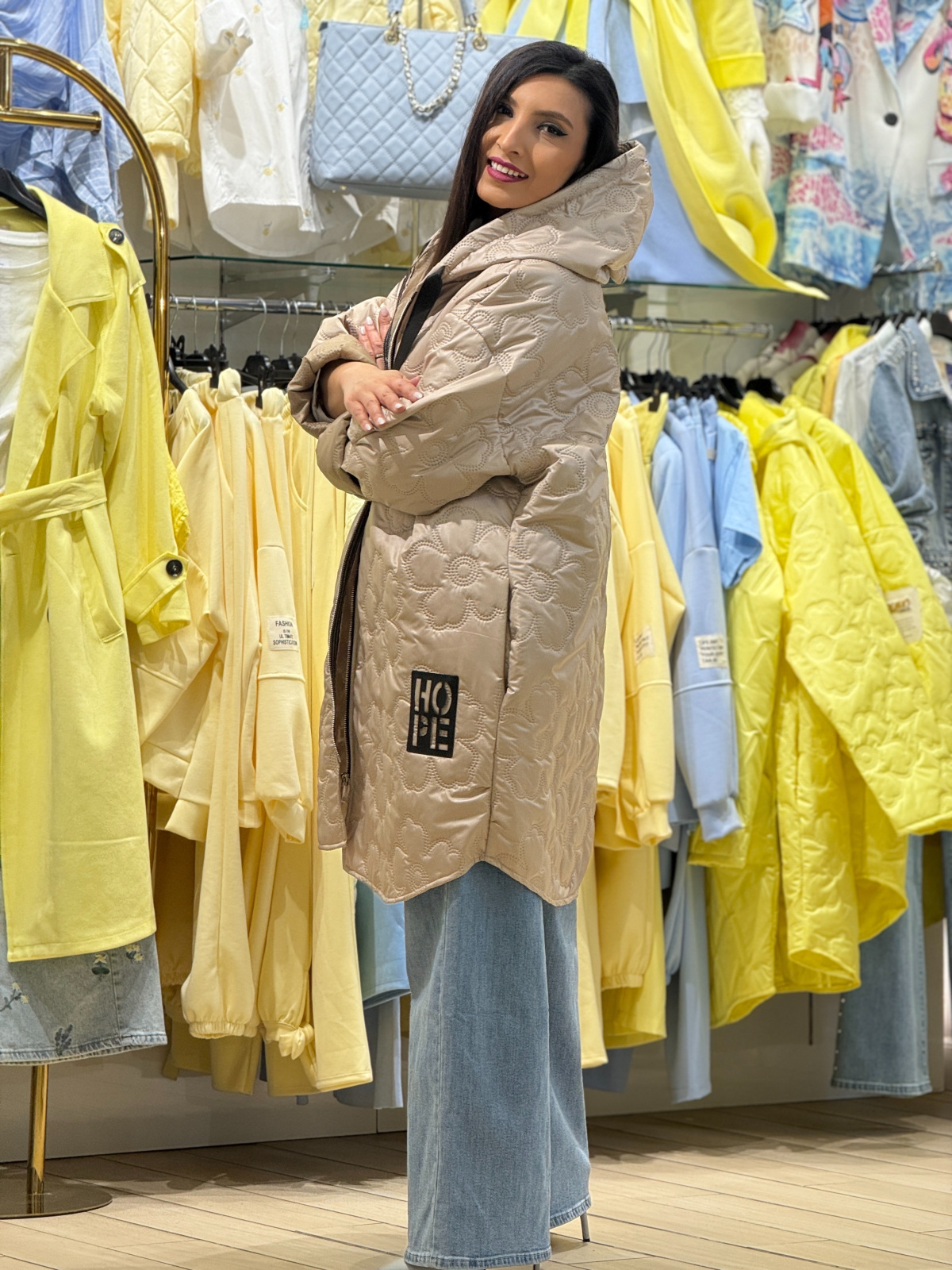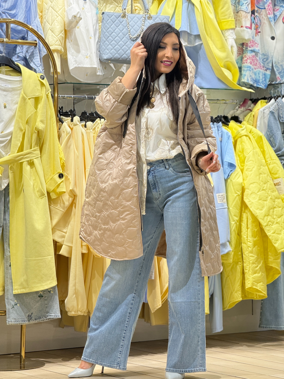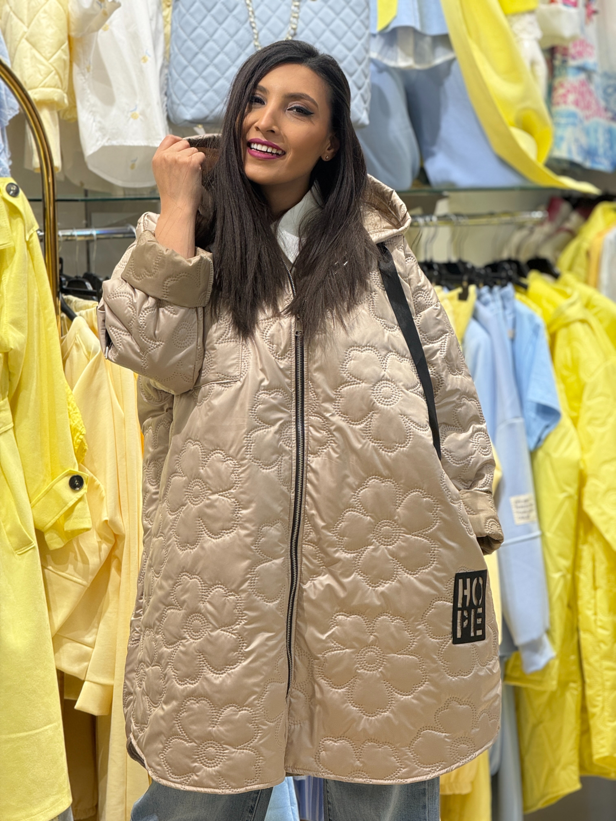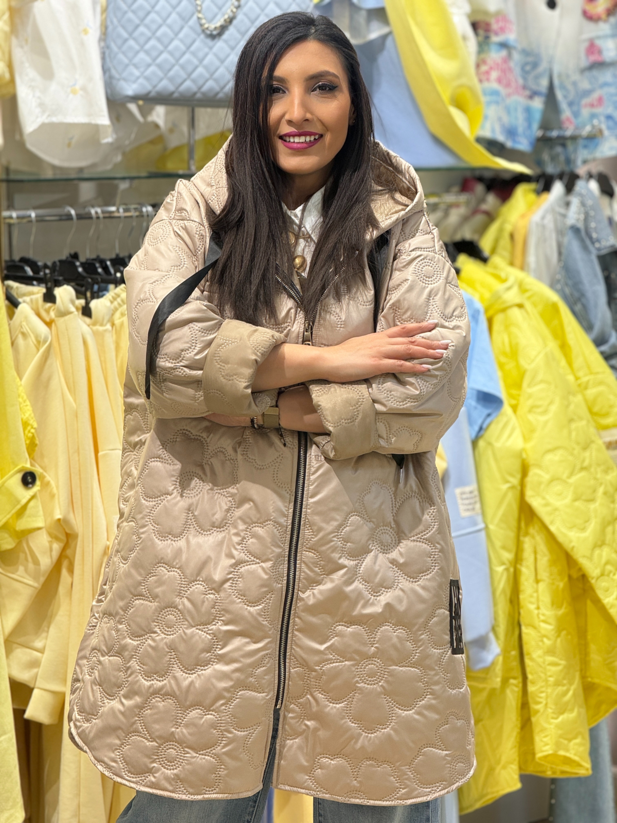 Jachetă damă cu croială lejeră cu glugă și model matlasat cu motive florale reliefate