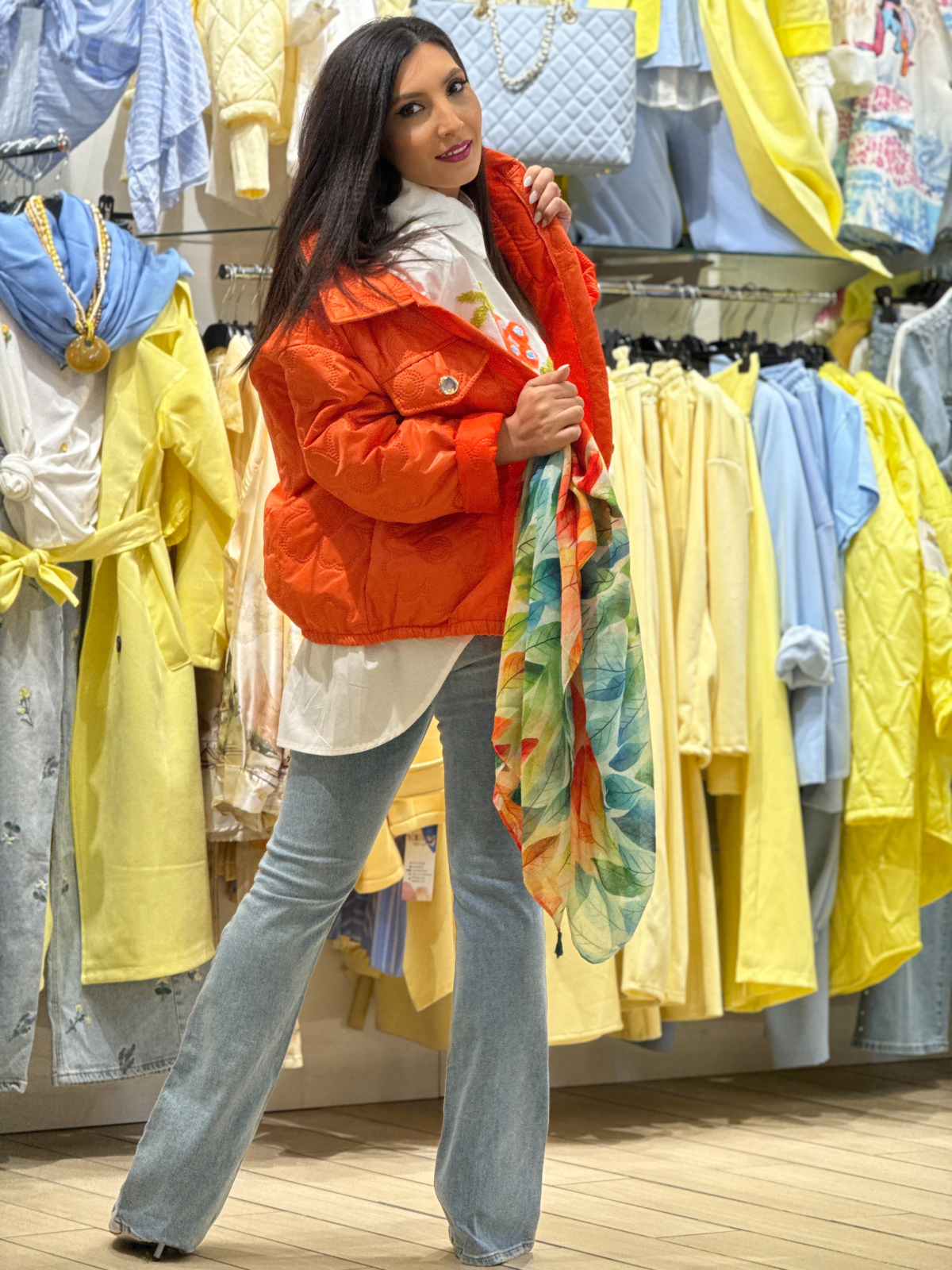 Jachetă damă scurtă cu croială lejeră, guler clasic tip cămașă, închidere frontală cu nasturi metalici, buzunare aplicate cu clapetă pe piept și model matlasat cu motive florale reliefate pe toată suprafața, stil casual modern