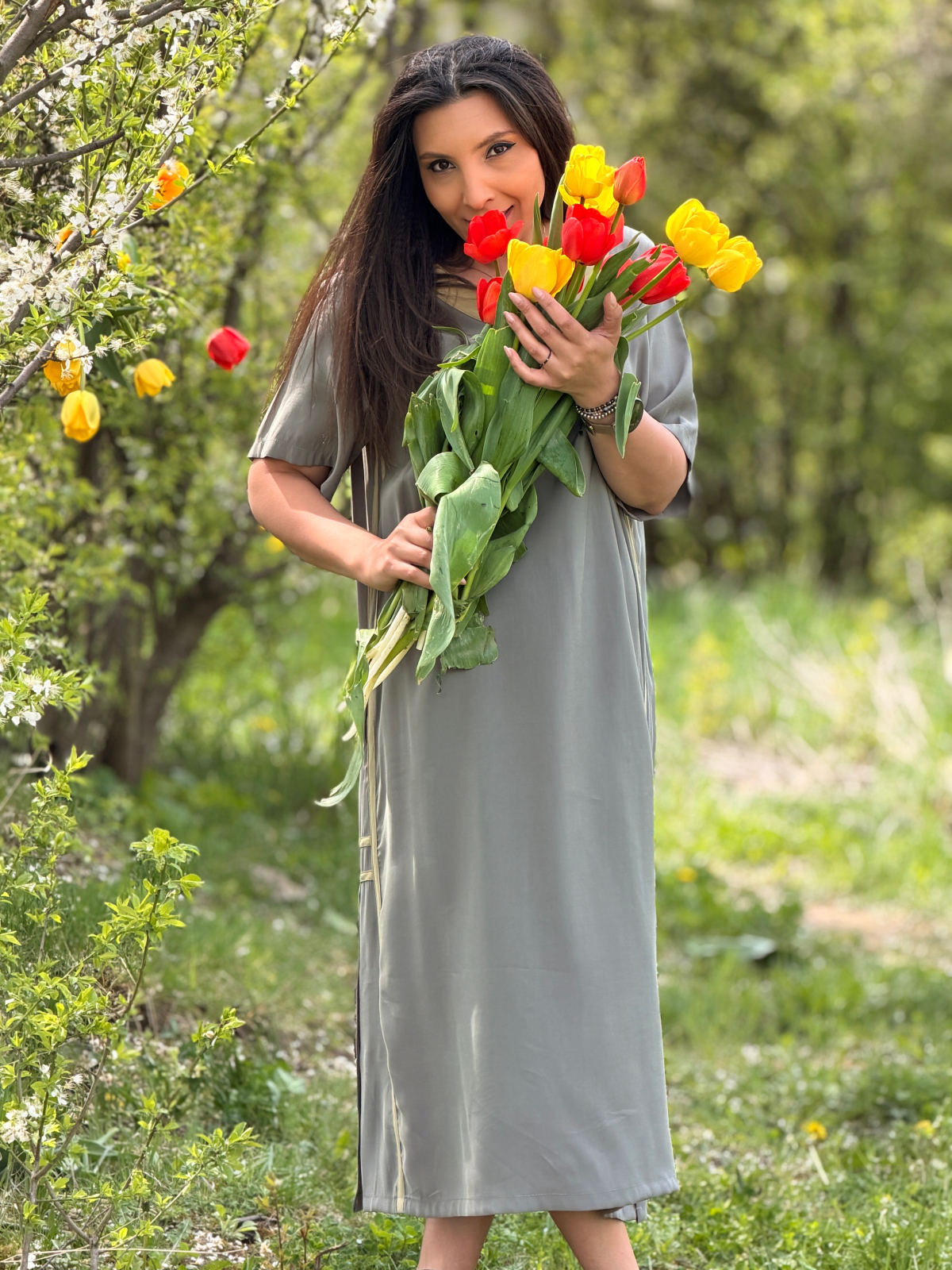 Această rochie poate fi purtată la un brunch cu prietenii sau la o ieșire în oraș. Este versatilă și se adaptează ușor oricărei situații.