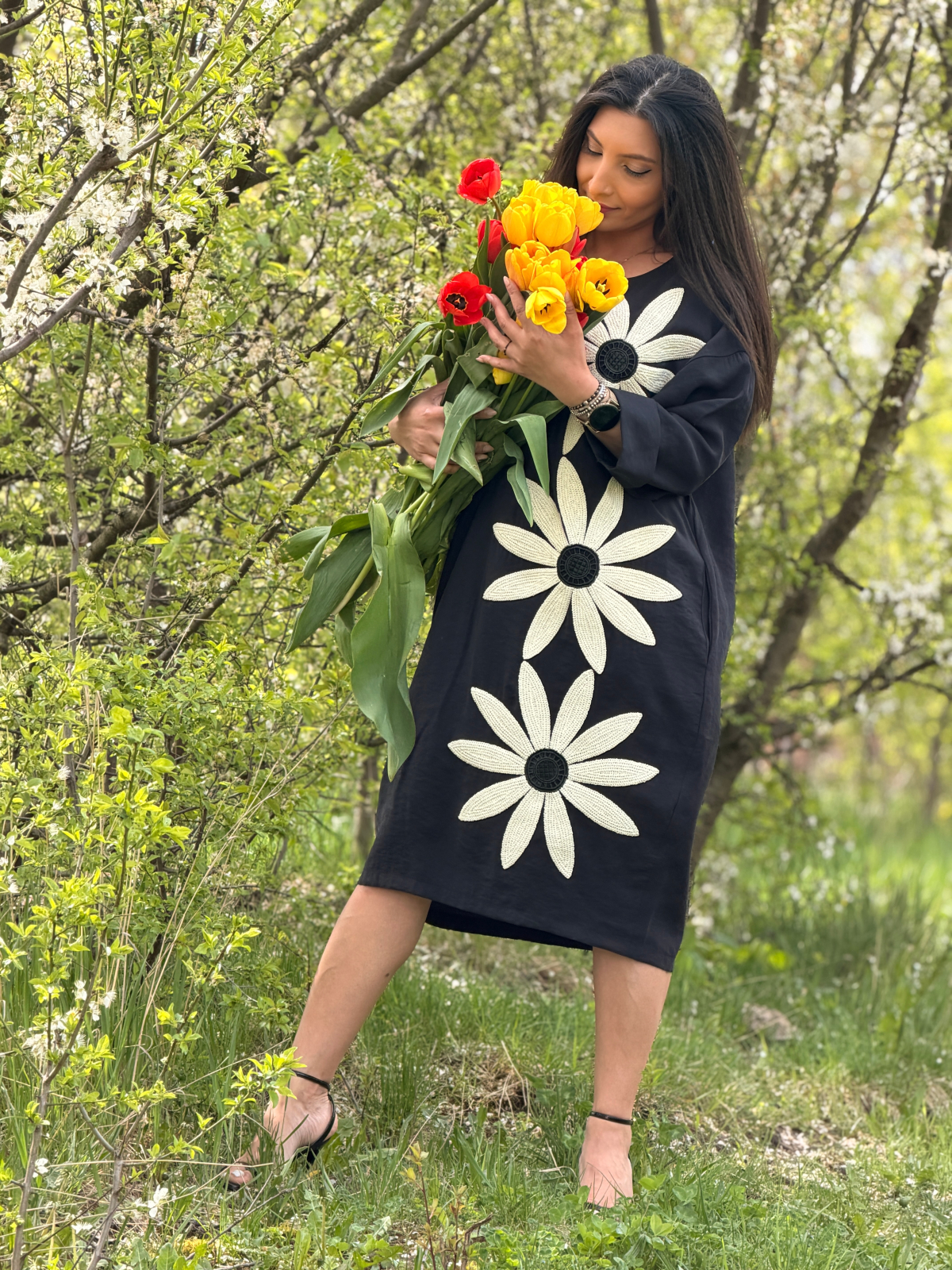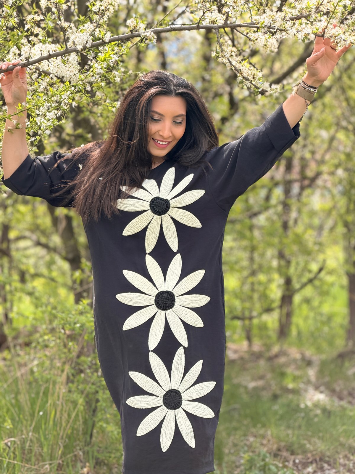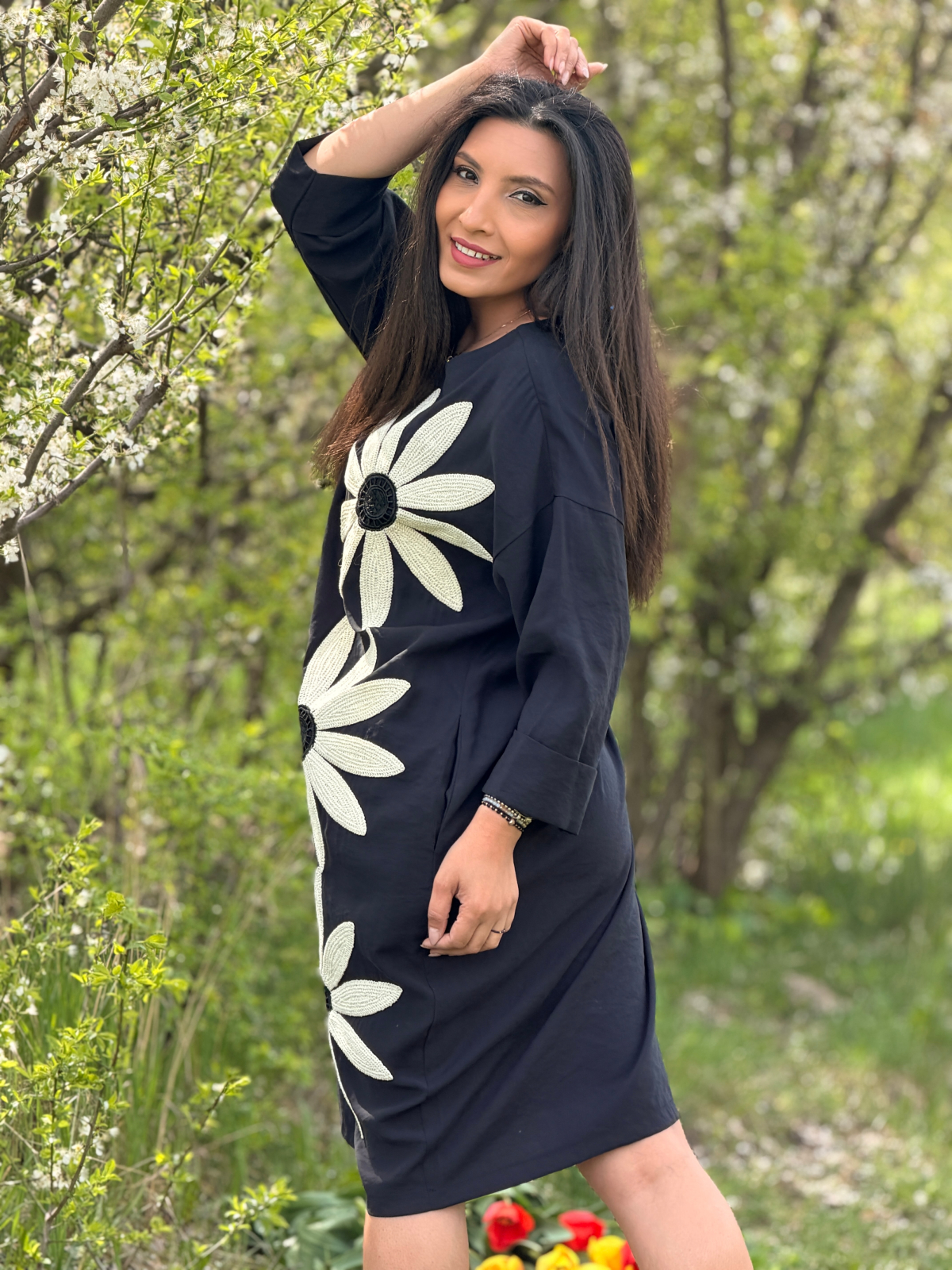 Croiala modernă și materialul confortabil îți permit să te bucuri de fiecare moment, în timp ce accesoriul floral adaugă o notă personalizată.