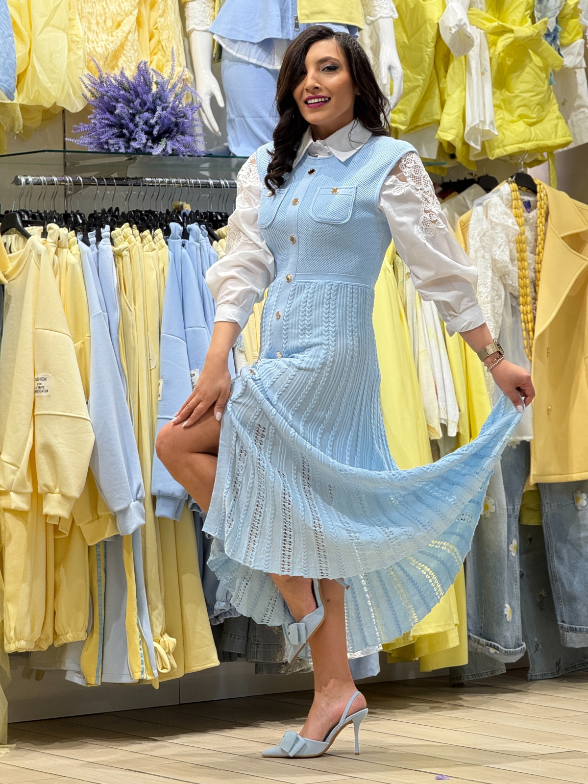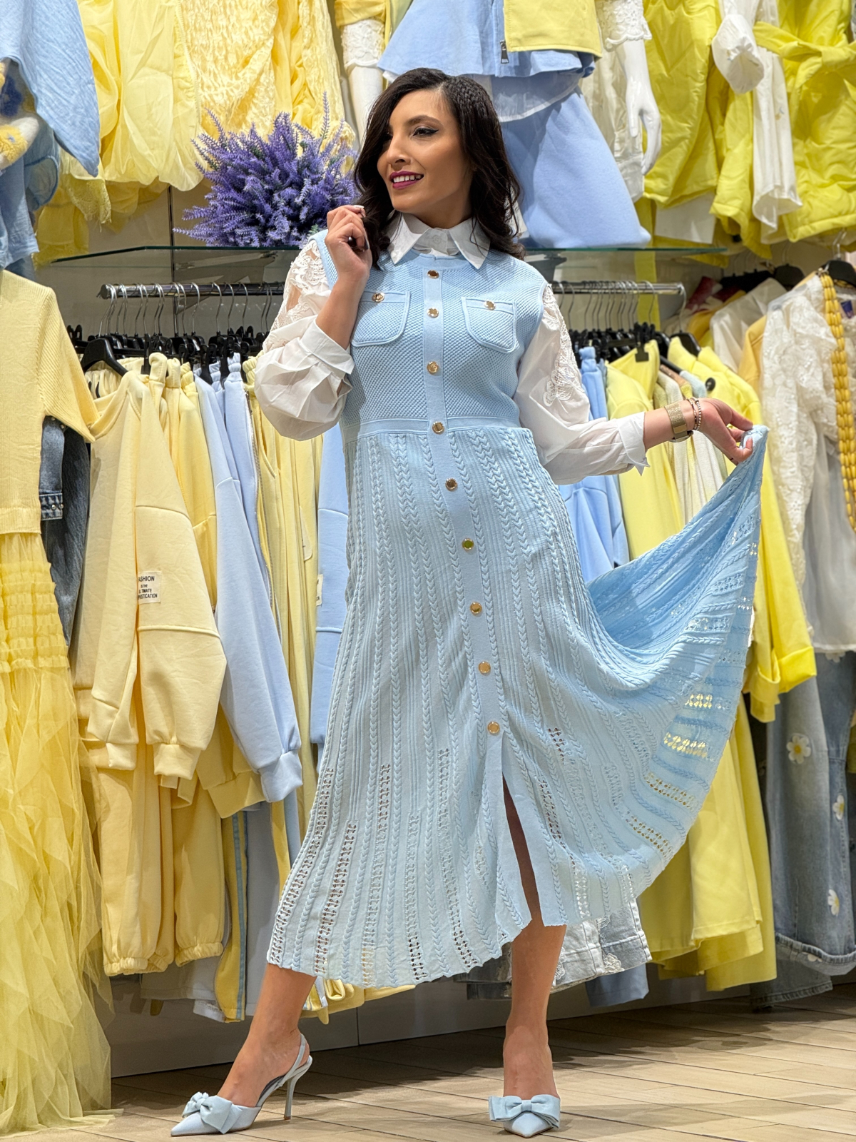 ◯ Rochie tricotată, fără mâneci, nasturi decorativi.