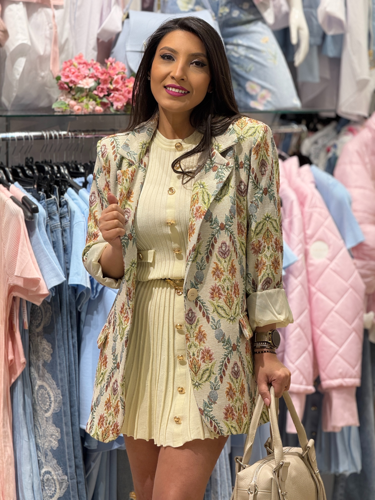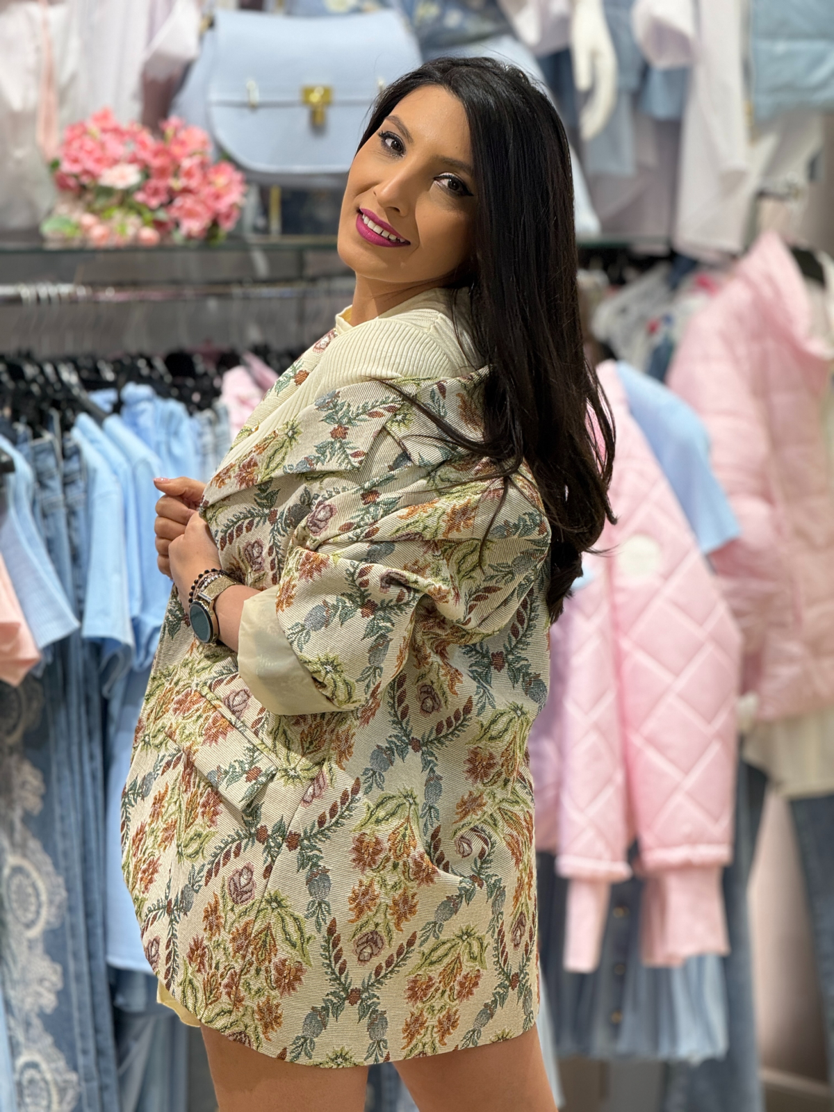Imprimeul floral ornamental și detaliile decorative aduc o notă de sofisticare, transformând acest sacou într-o piesă de rezistență în garderoba ta.