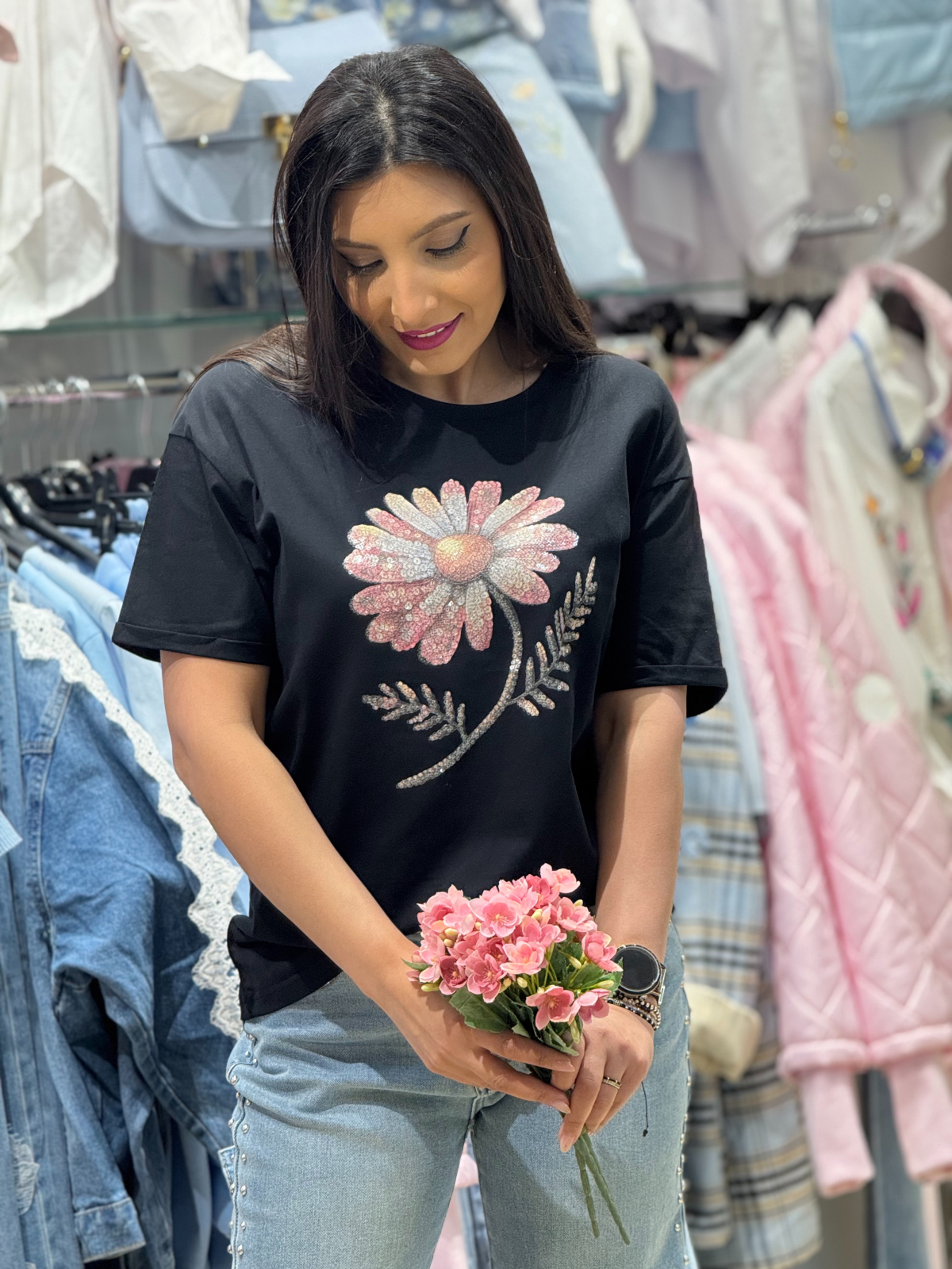 Simte veselia unei zile de primăvară în acest tricou casual cu imprimeu floral central.
