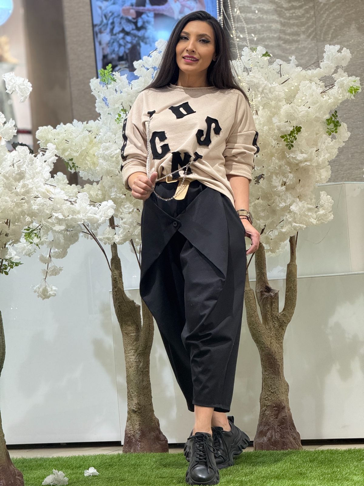 • Pantaloni cu detaliu petrecut în partea frontală