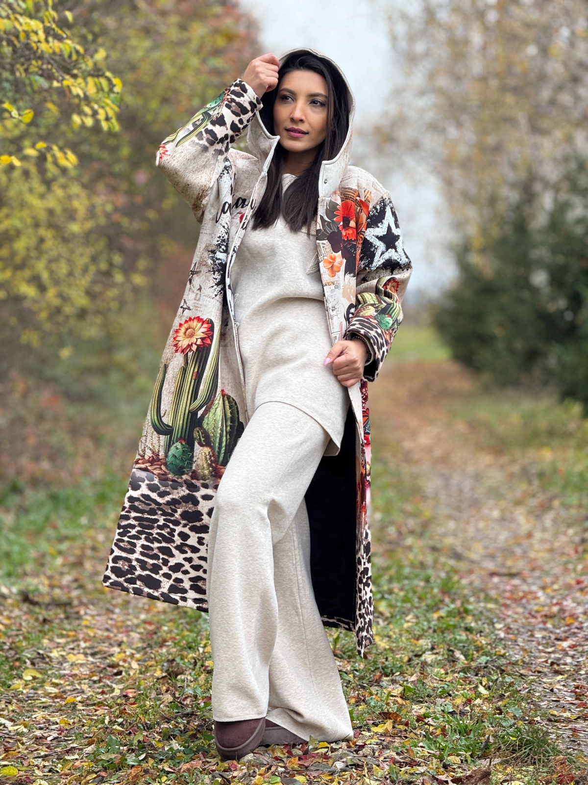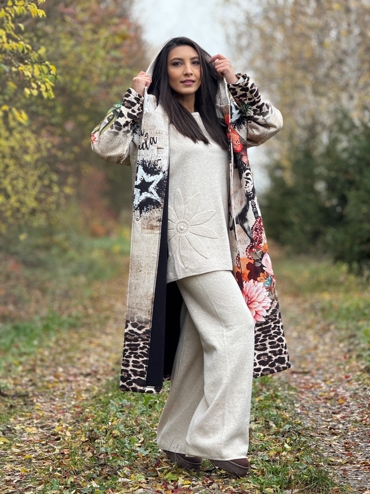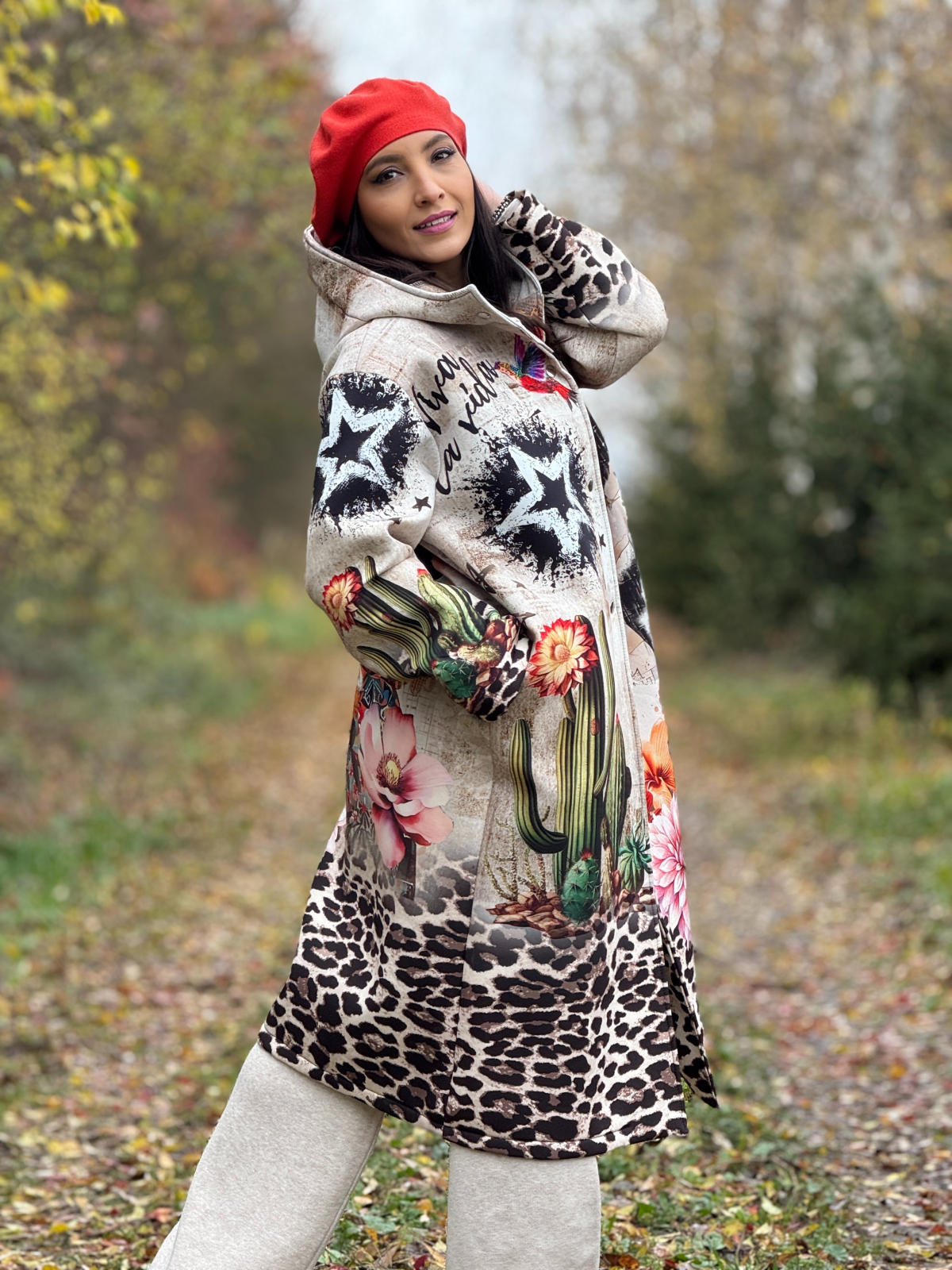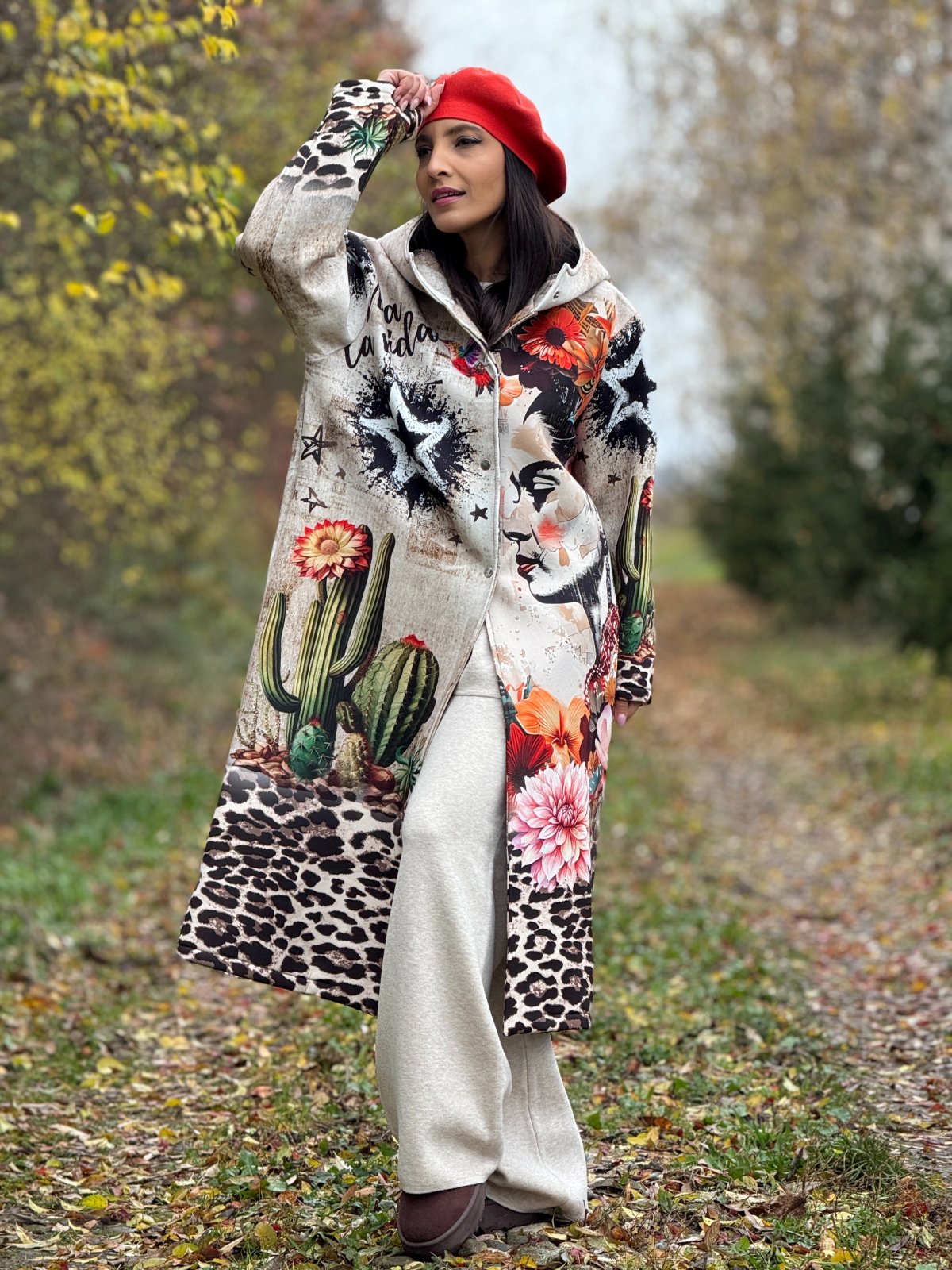 Palton artistic cu imprimeu Frida si accente florale