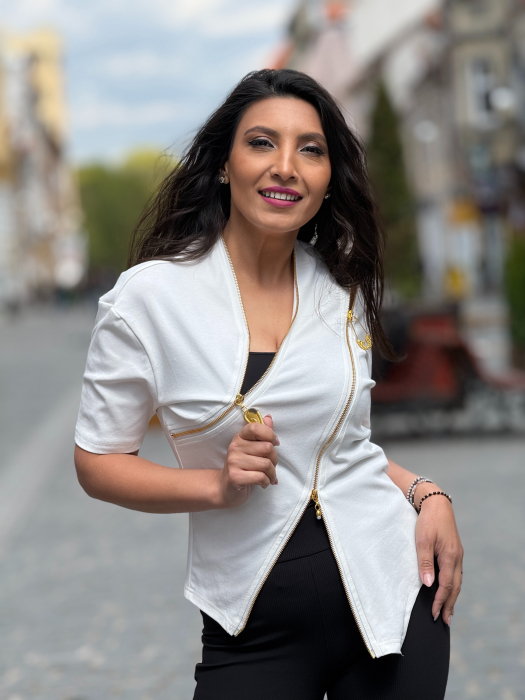 Îmbrăcămintea potrivită te ajută să te simți liberă și confortabilă. Tricoul alb cu fermoare aurii îți oferă exact acest sentiment.
